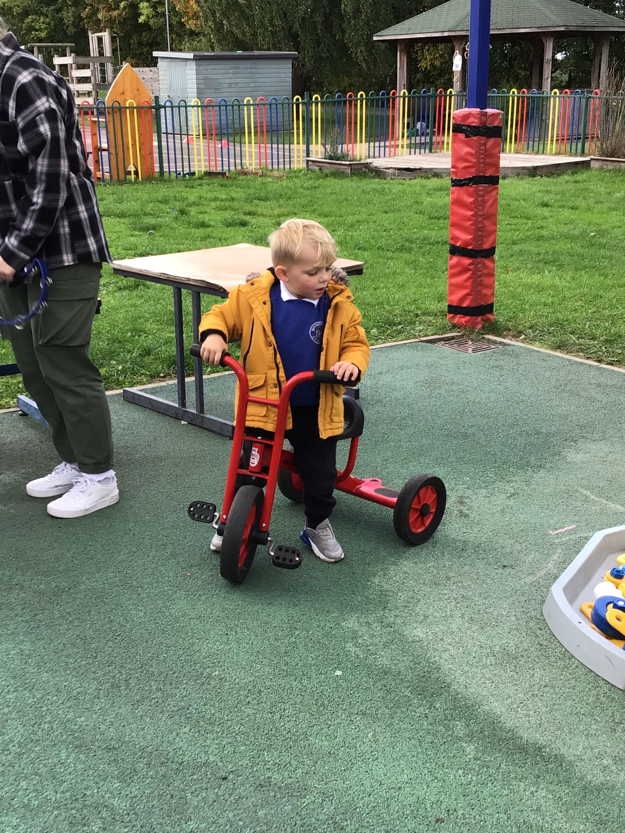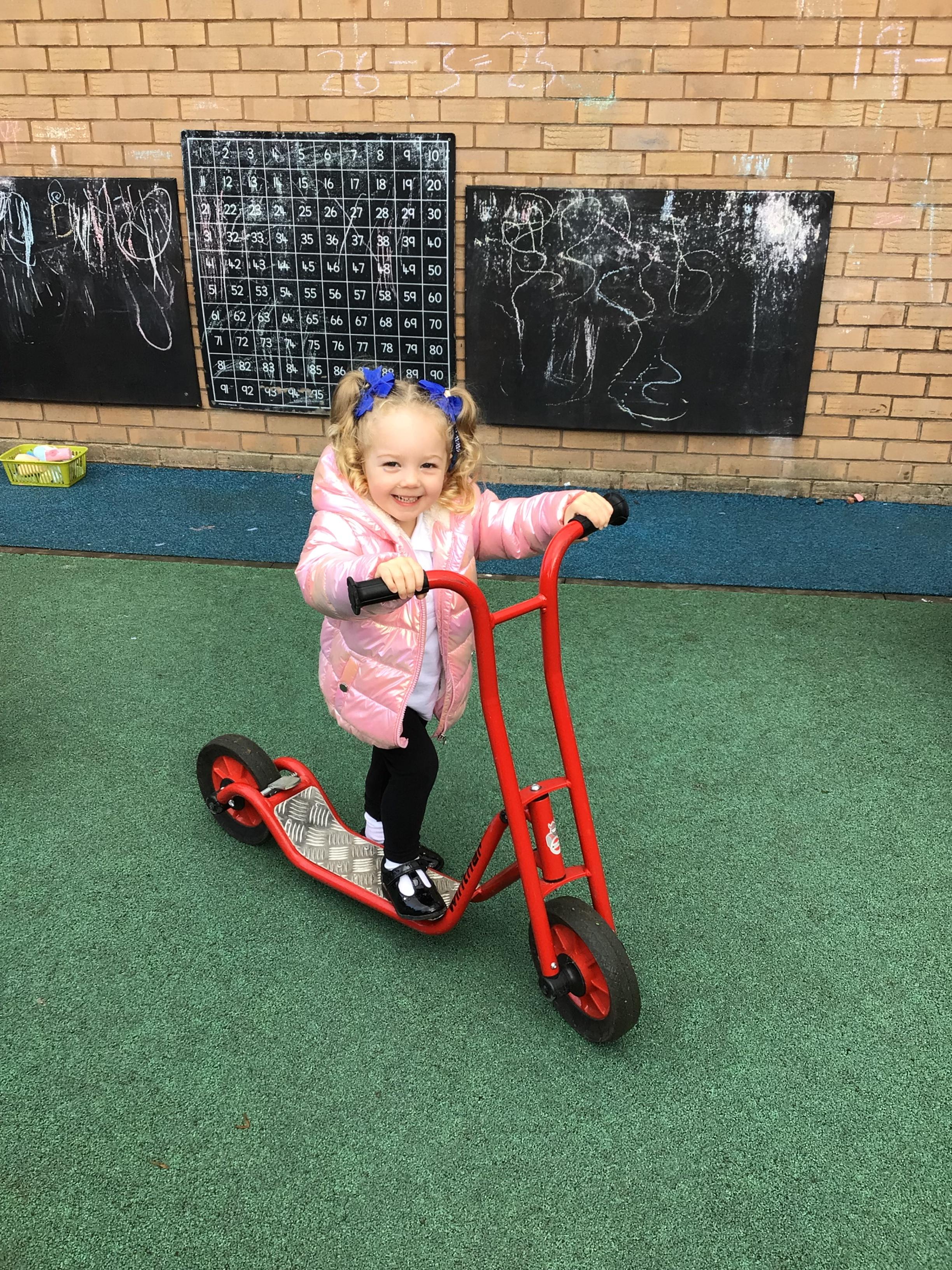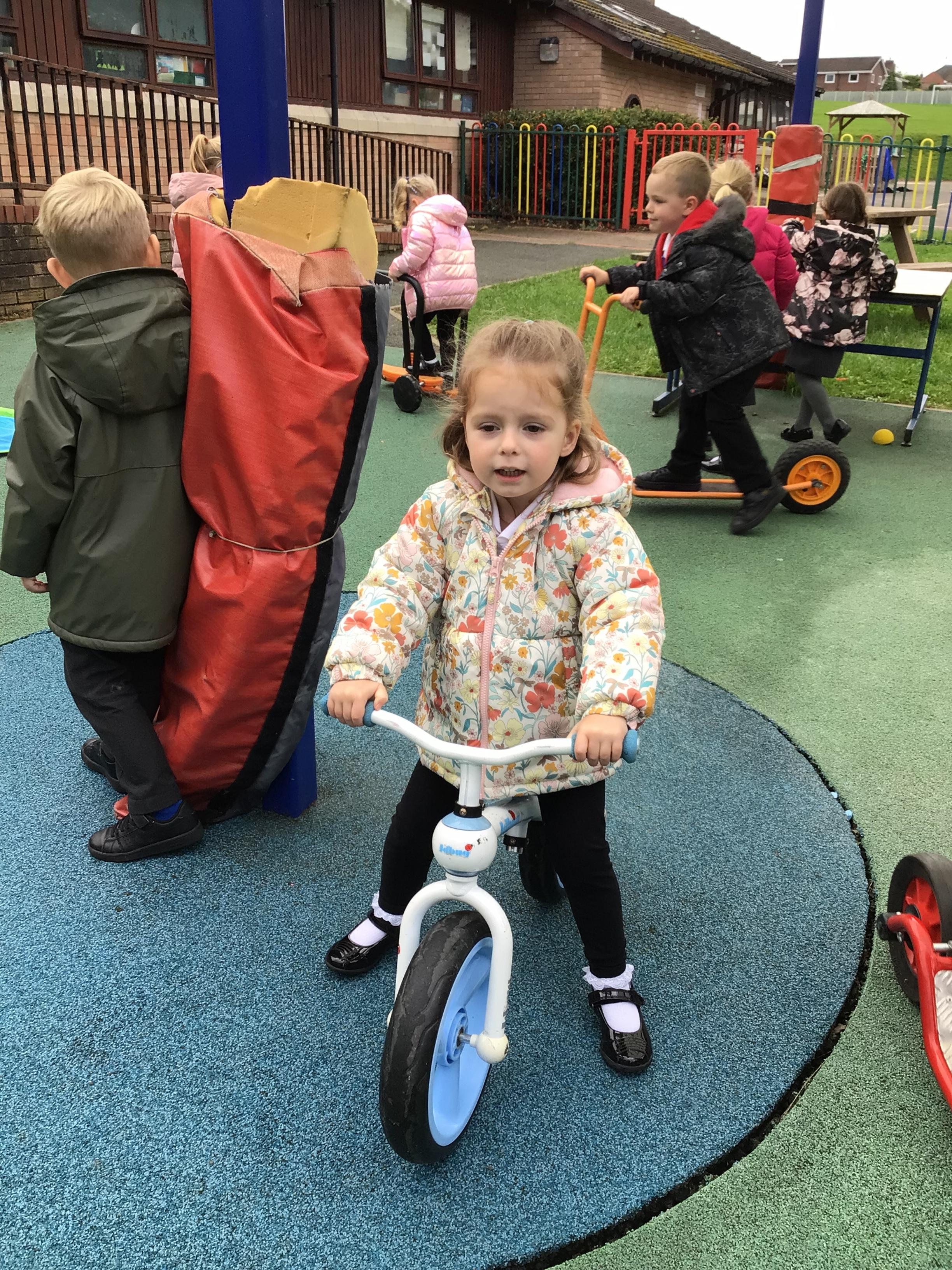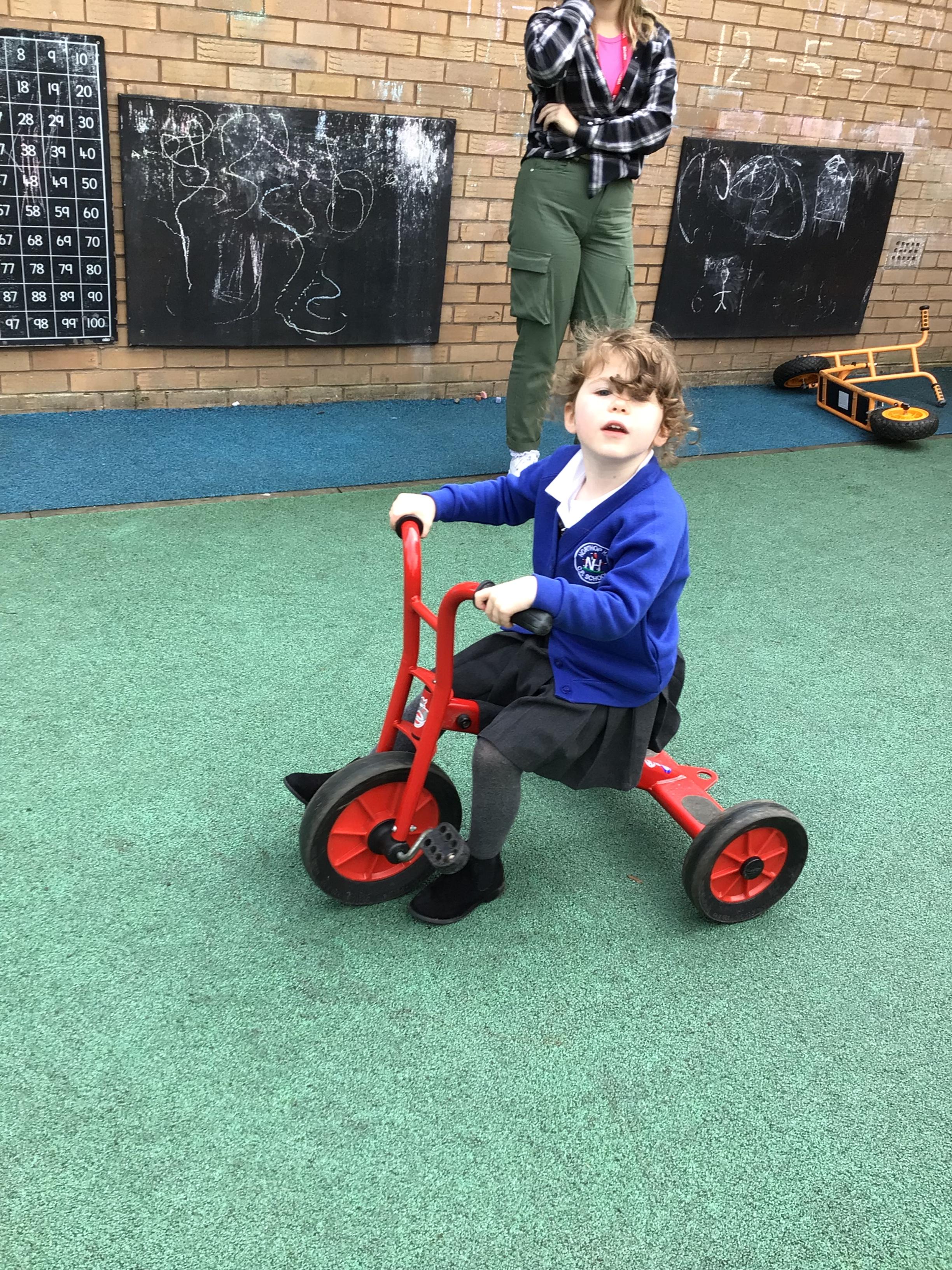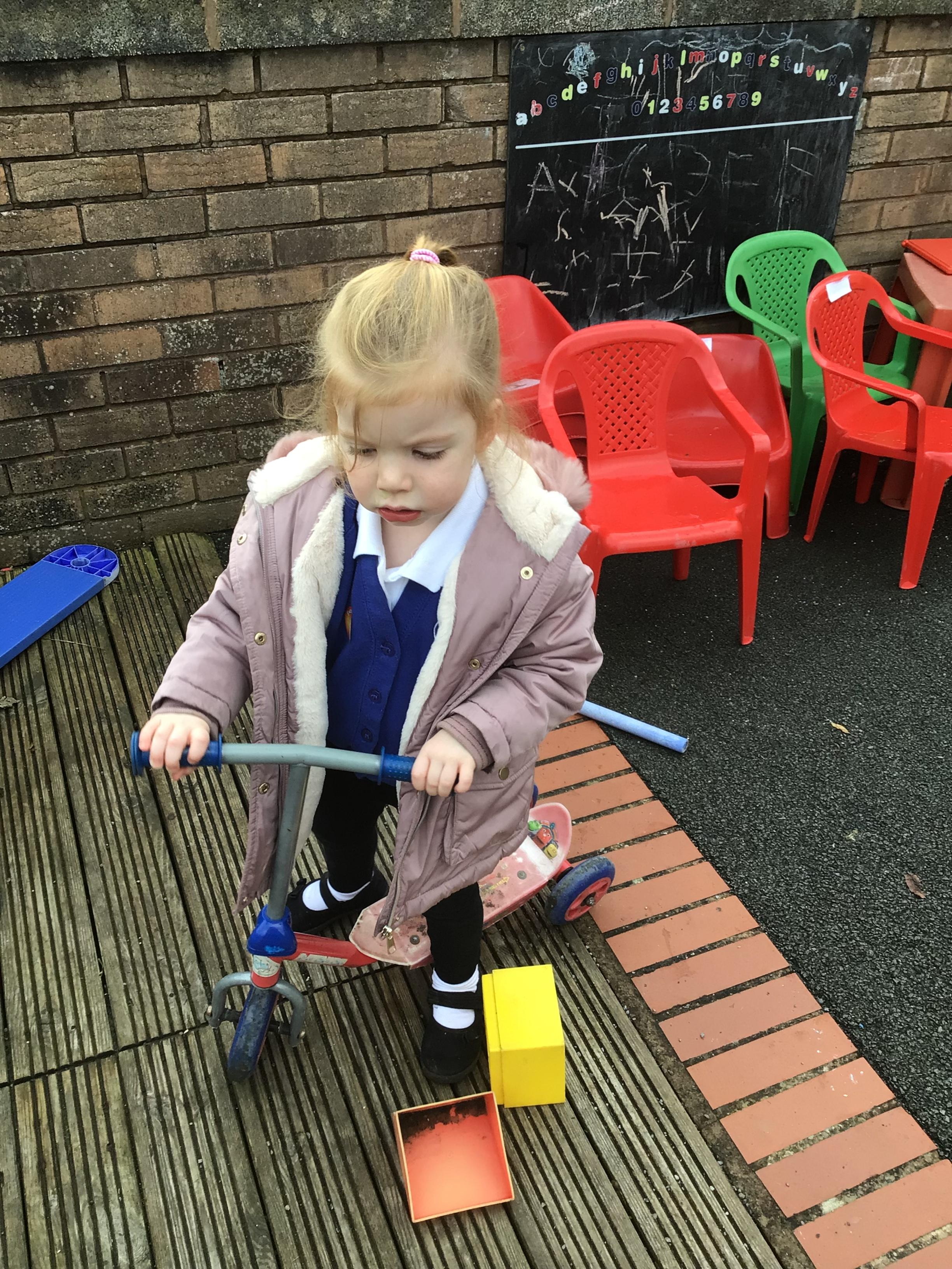 This week we played in the “big outside” area with the bikes, scooters and large construction.