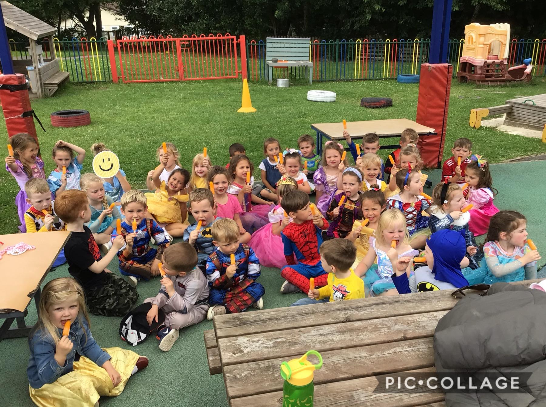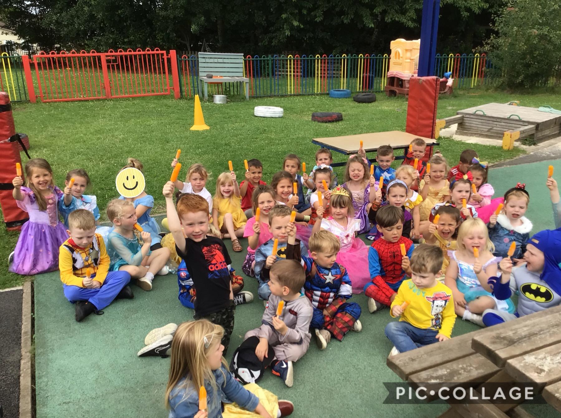 We had a costume day to celebrate the end of term. We wore a costume or our favourite clothes. We all had an ice cream!