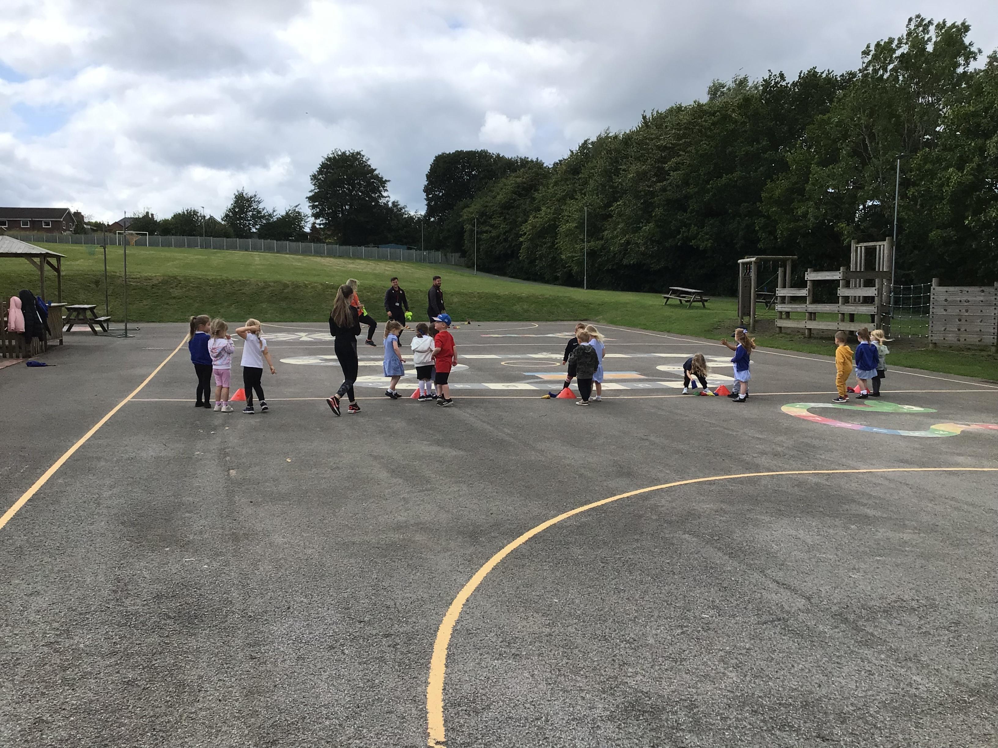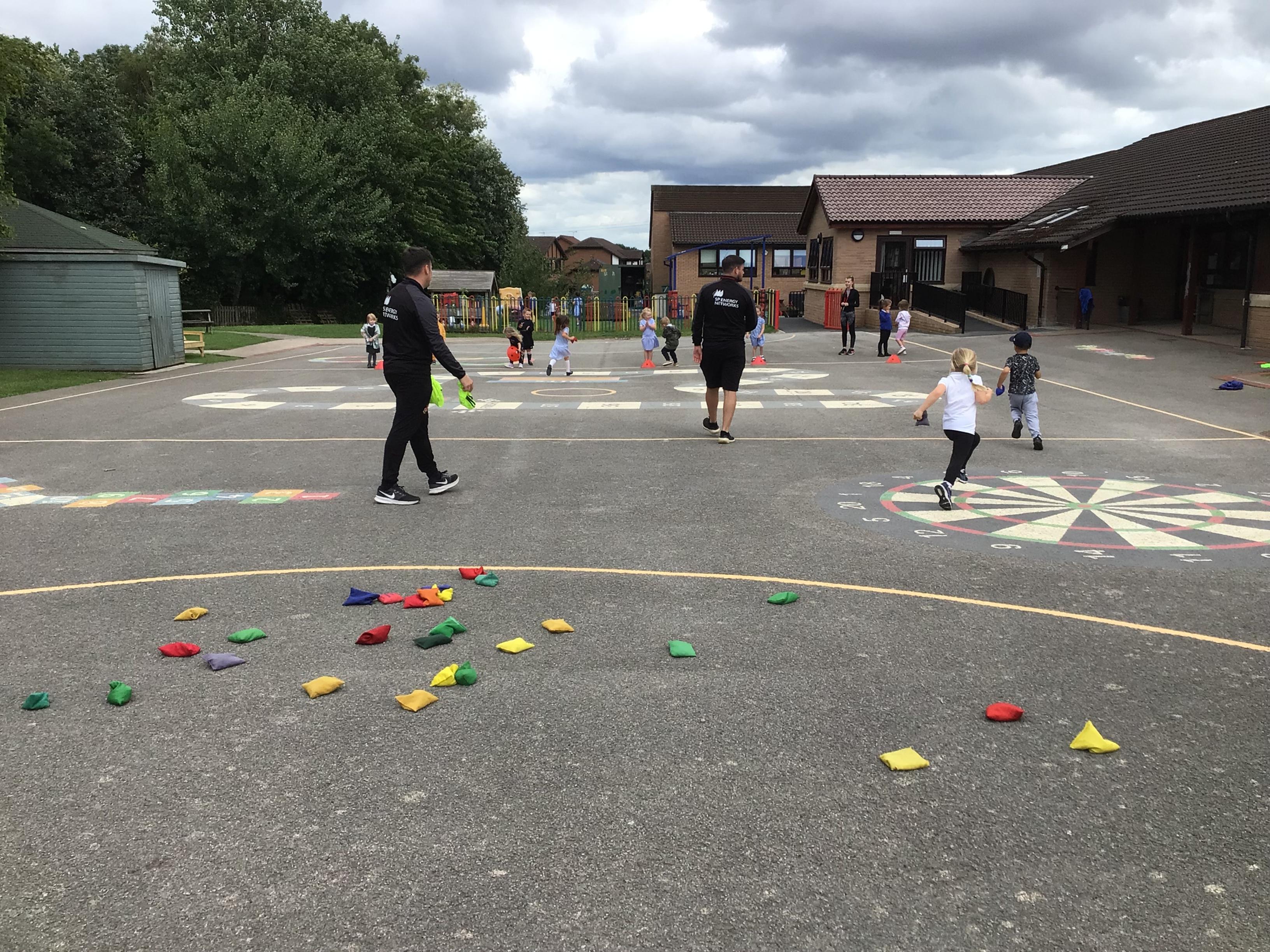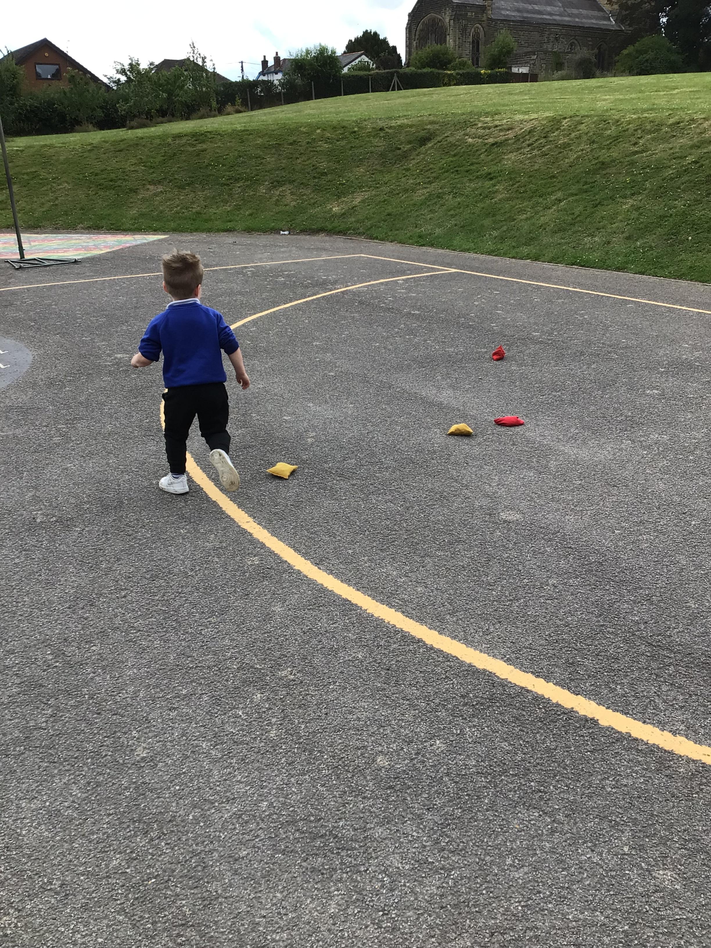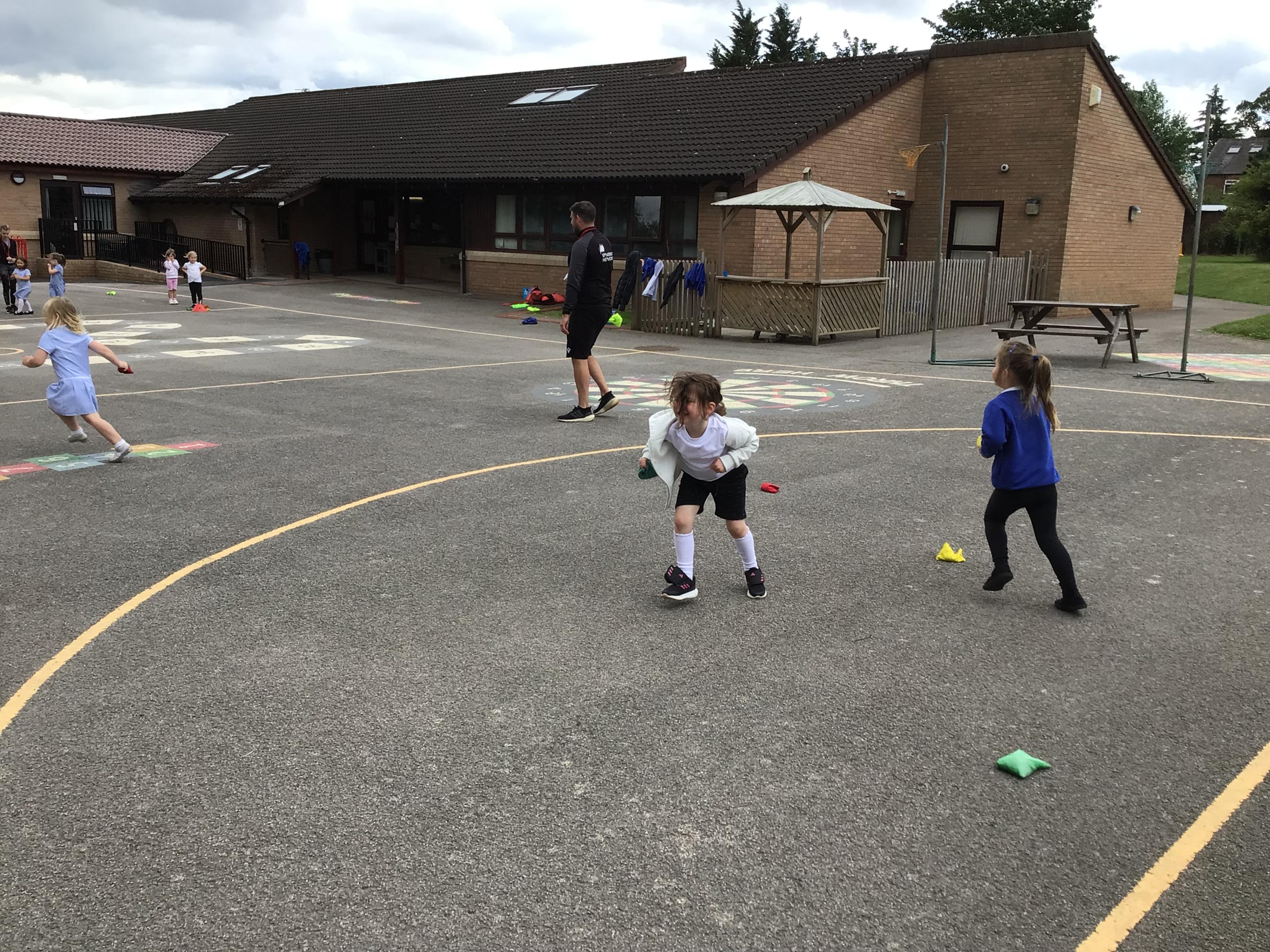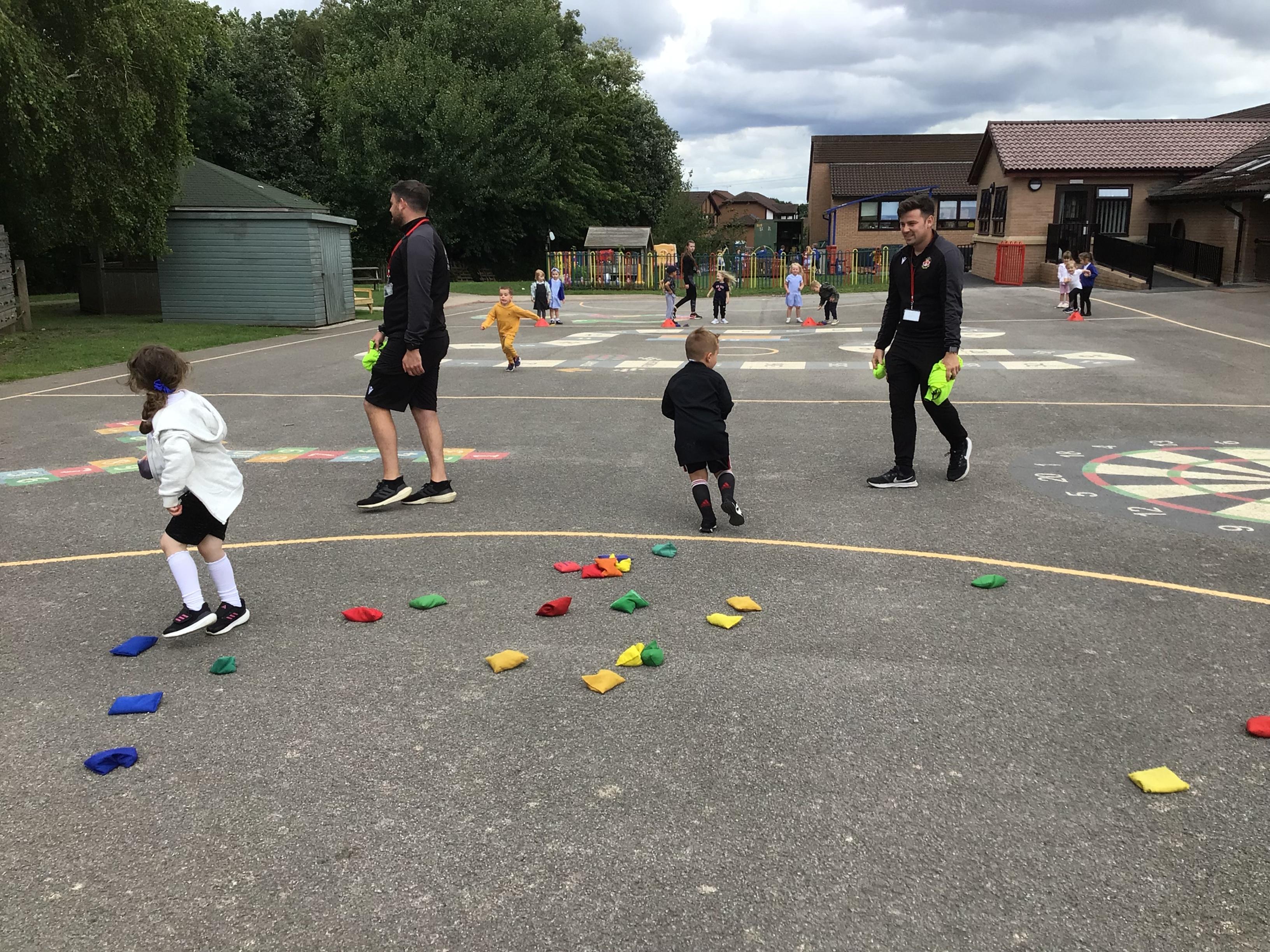 We had PE with Steve and Josh from Wrexham FC on the big yard.  We played 2 games, in one game we had to collect bean bags and see who had the most!  We had great fun.