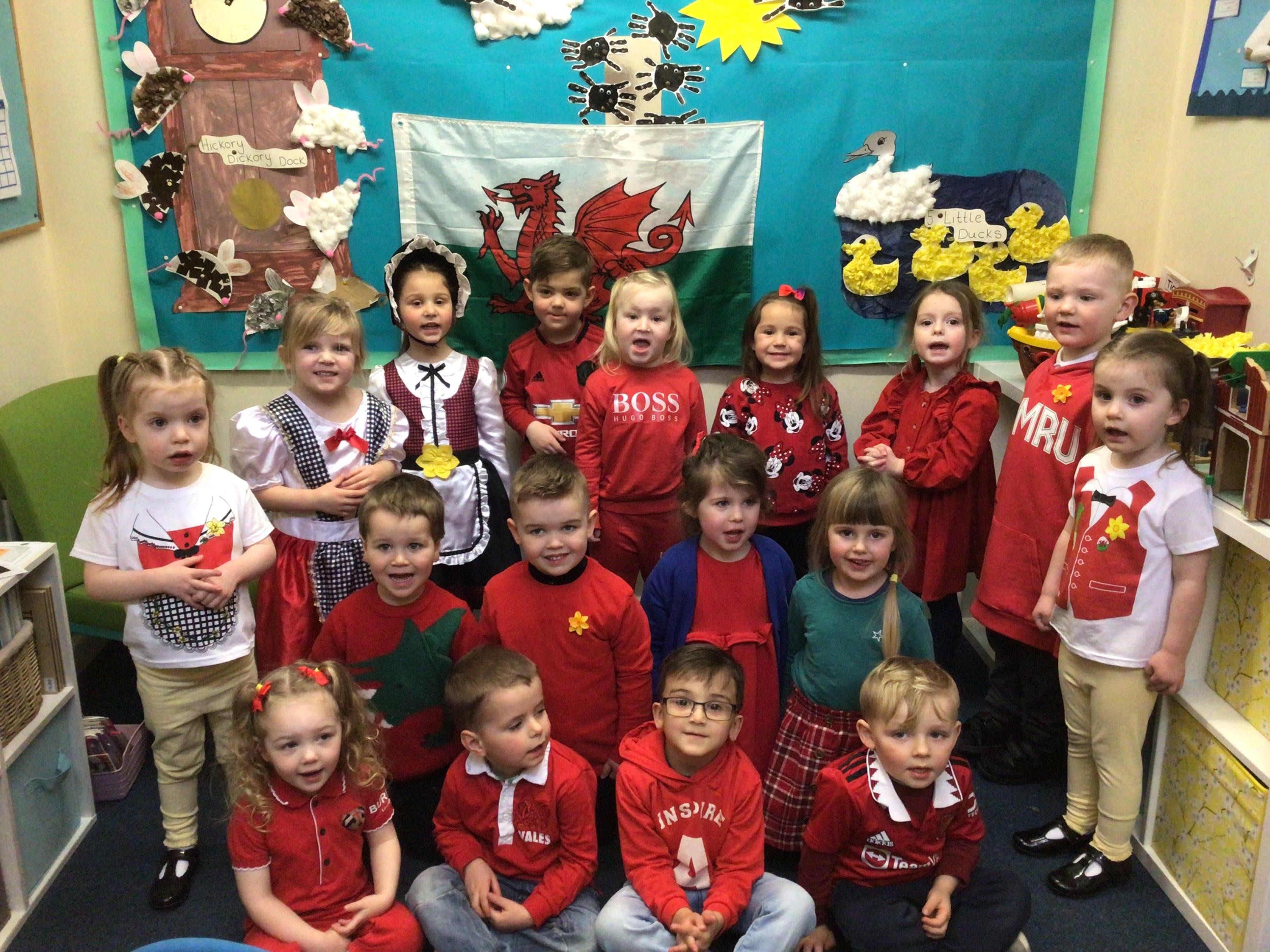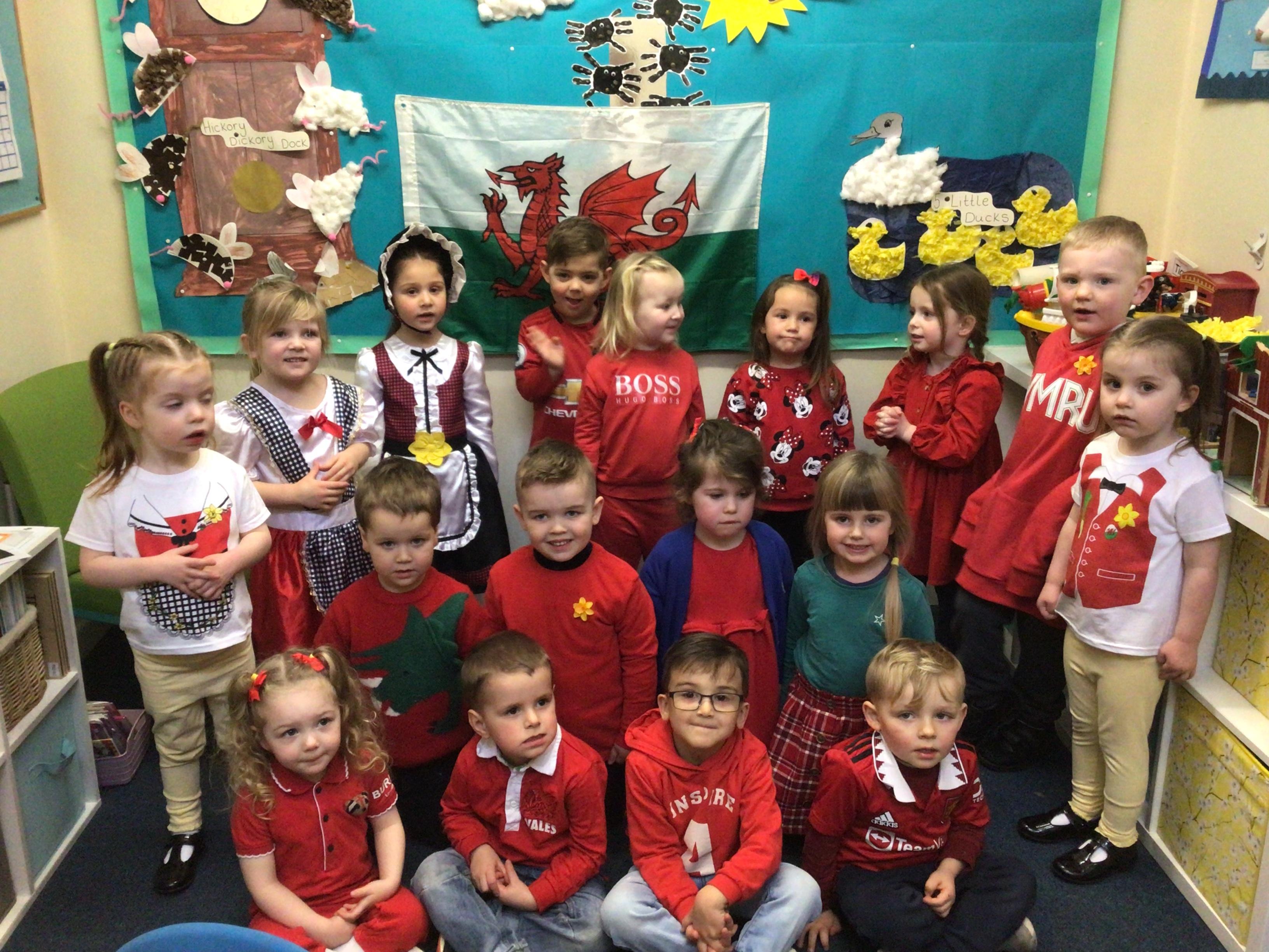 We celebrated St David’s Day today.  Everyone wore the colours of the Welsh flag or traditional Welsh costumes.  We made dragon pictures and at the end of the day we shared some Welsh songs with our families.