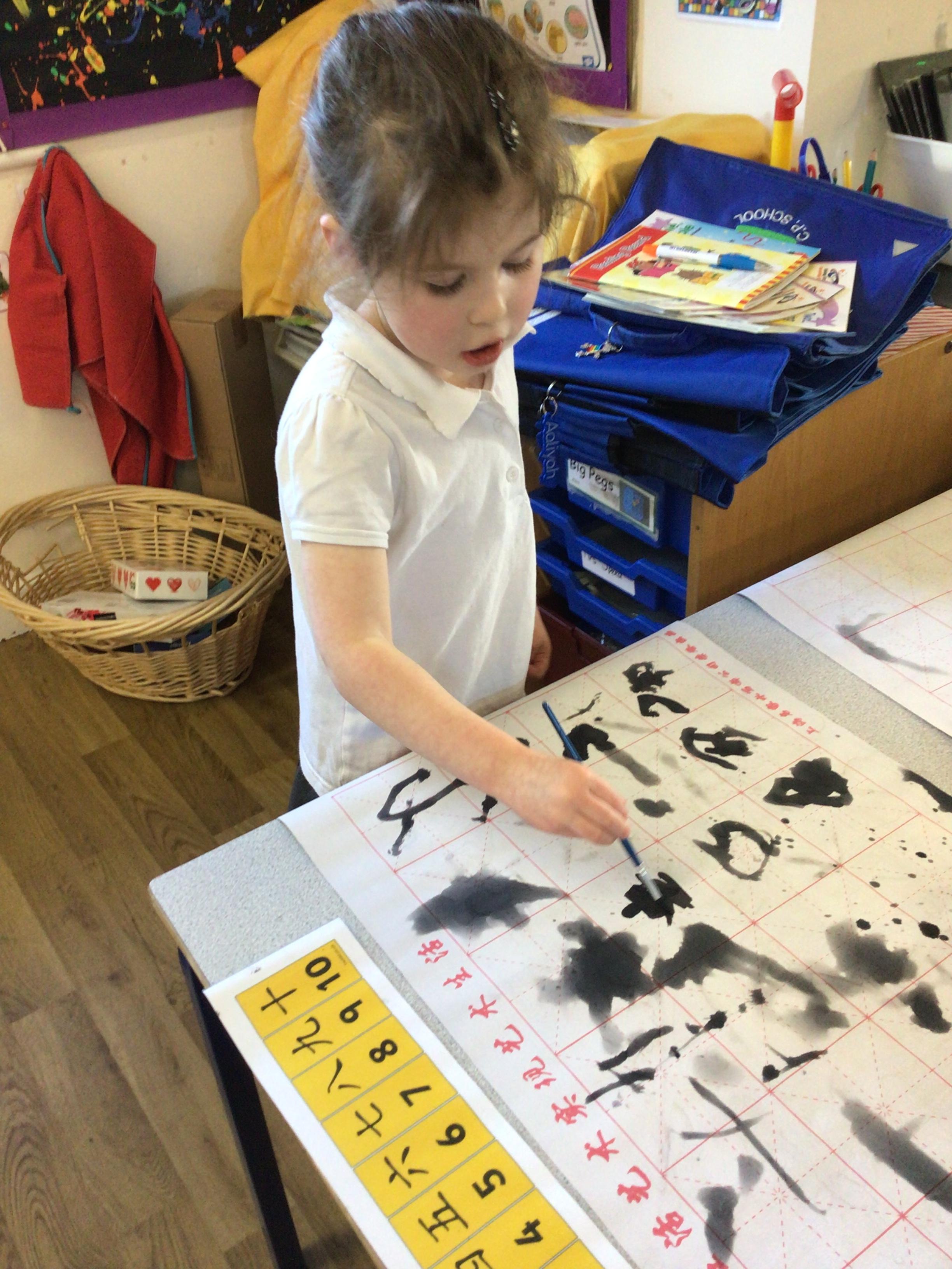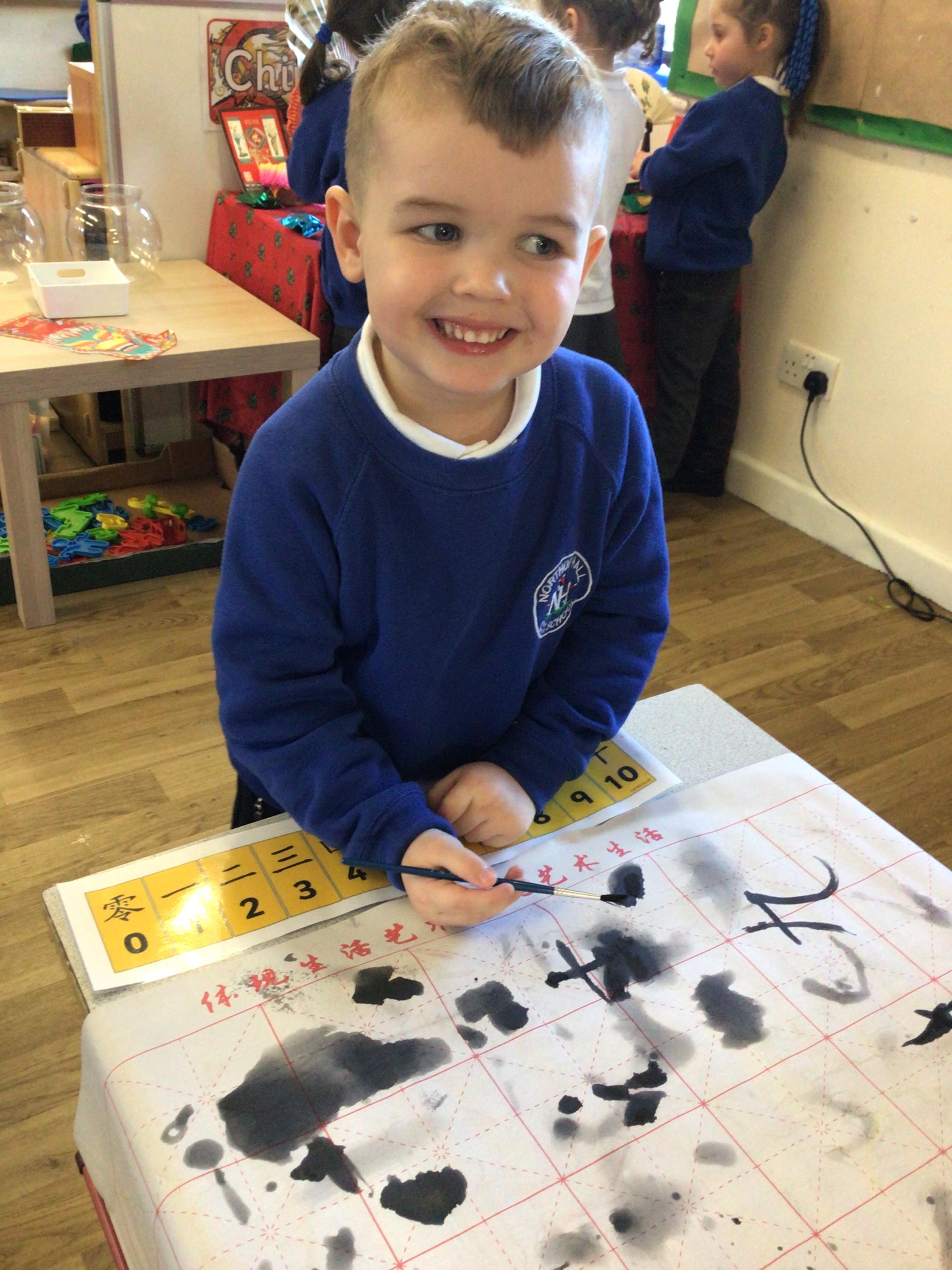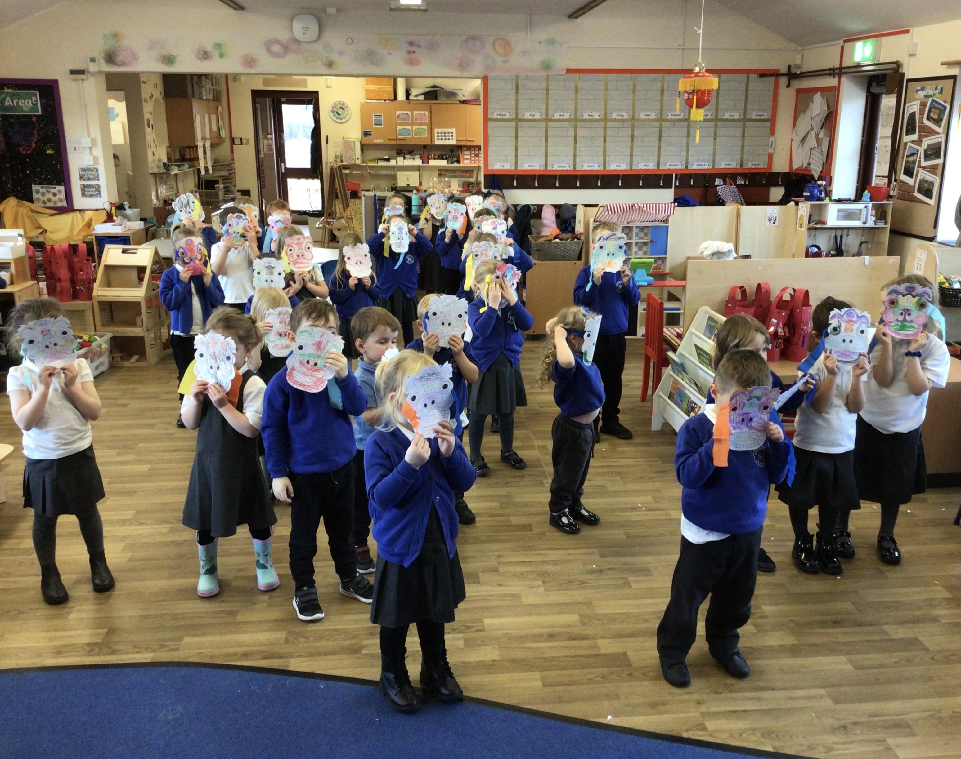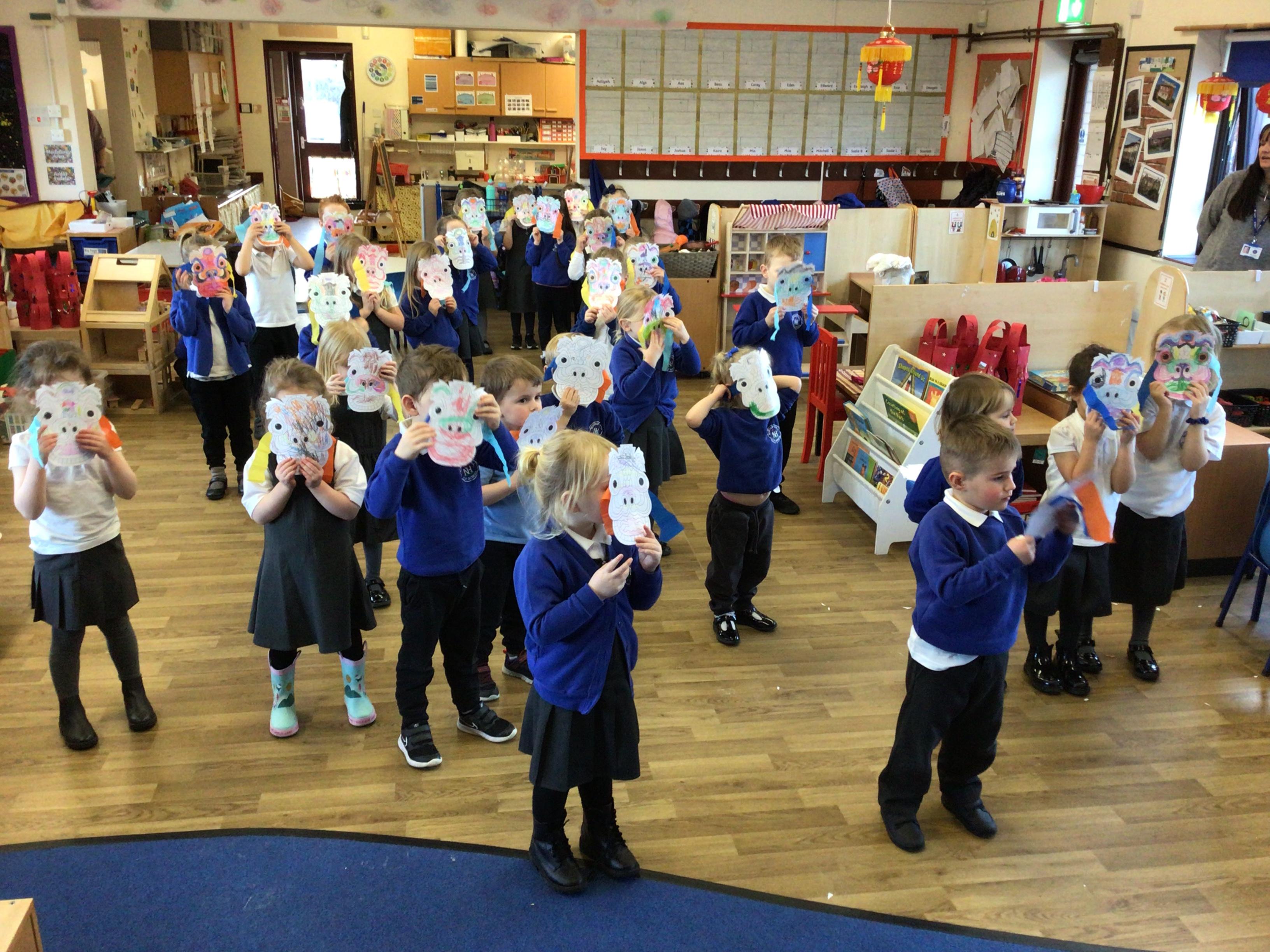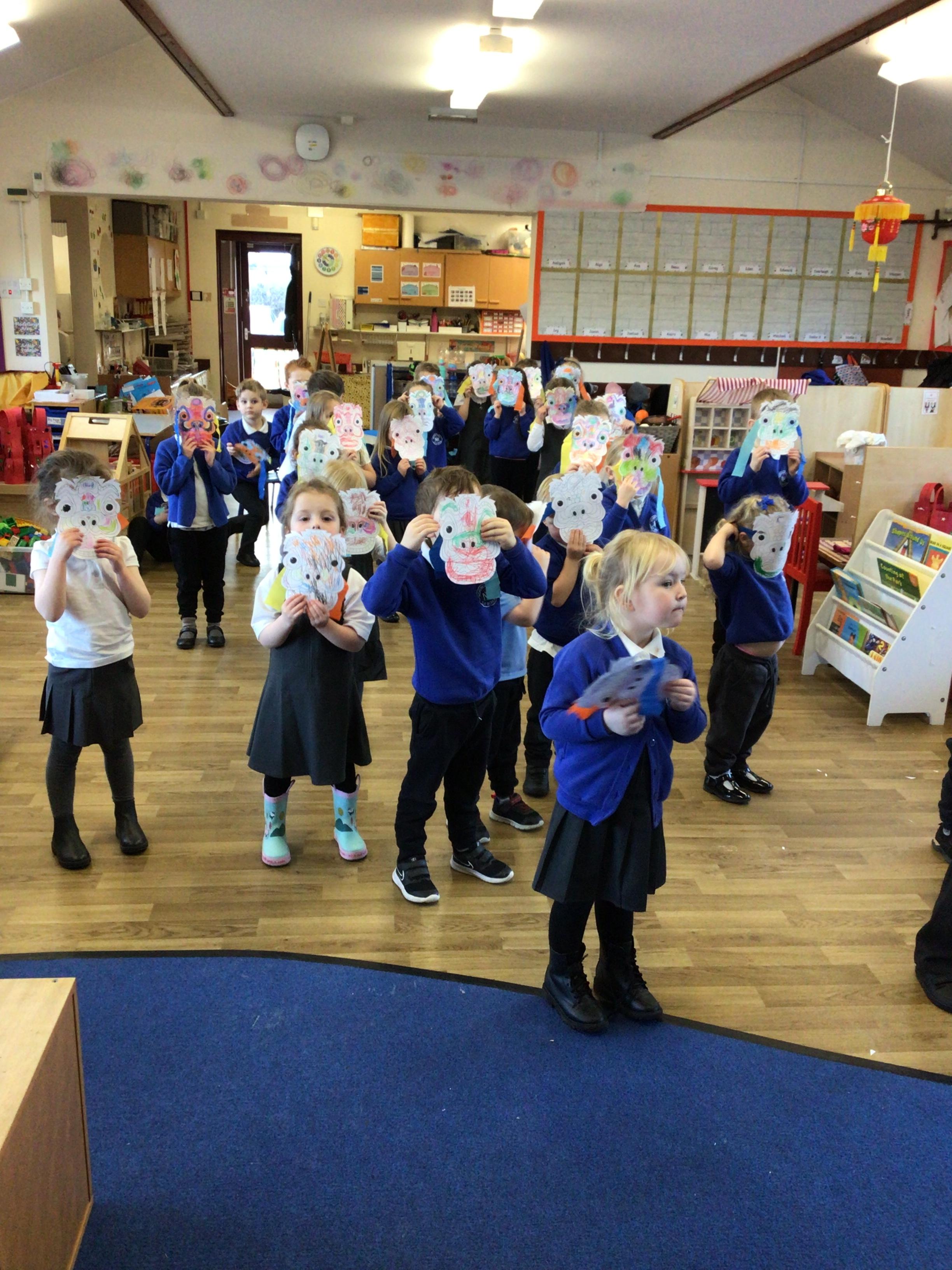 • We celebrated Chinese New Year by doing a traditional lion dance with our lion masks. We also had a go at writing some Chinese symbols and using chopsticks.