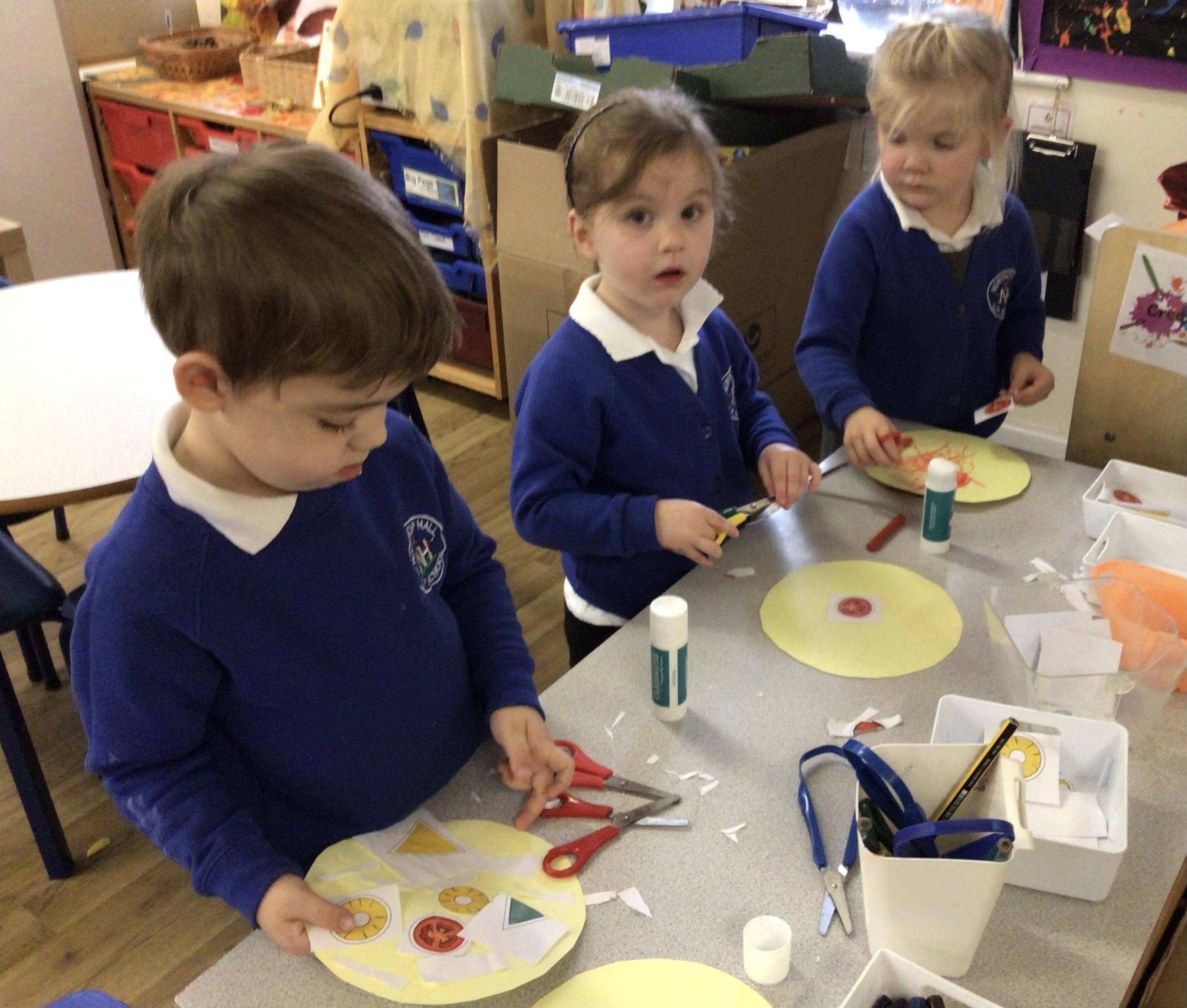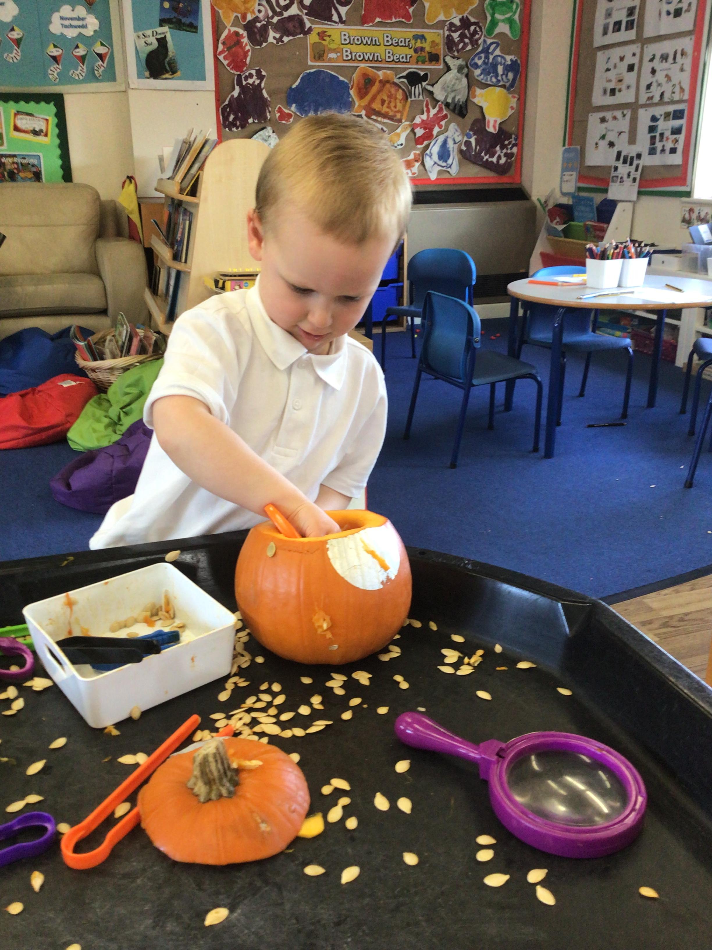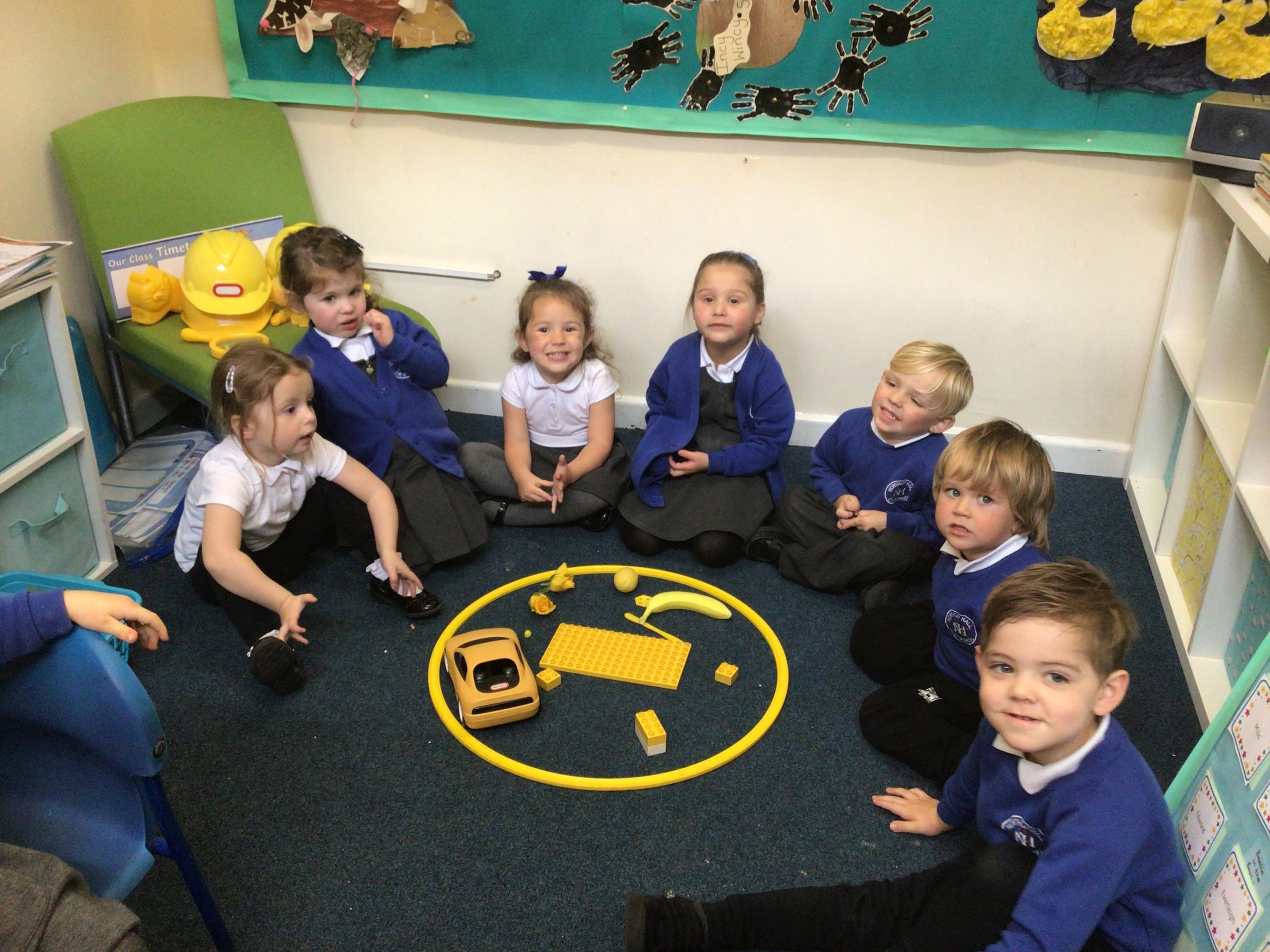 We have had another busy week in Nursery.  Our colour this week was yellow and we went on a yellow hunt. We have been singing Autumn songs, we collected leaves for leaf rubbings and we made a pumpkin.
