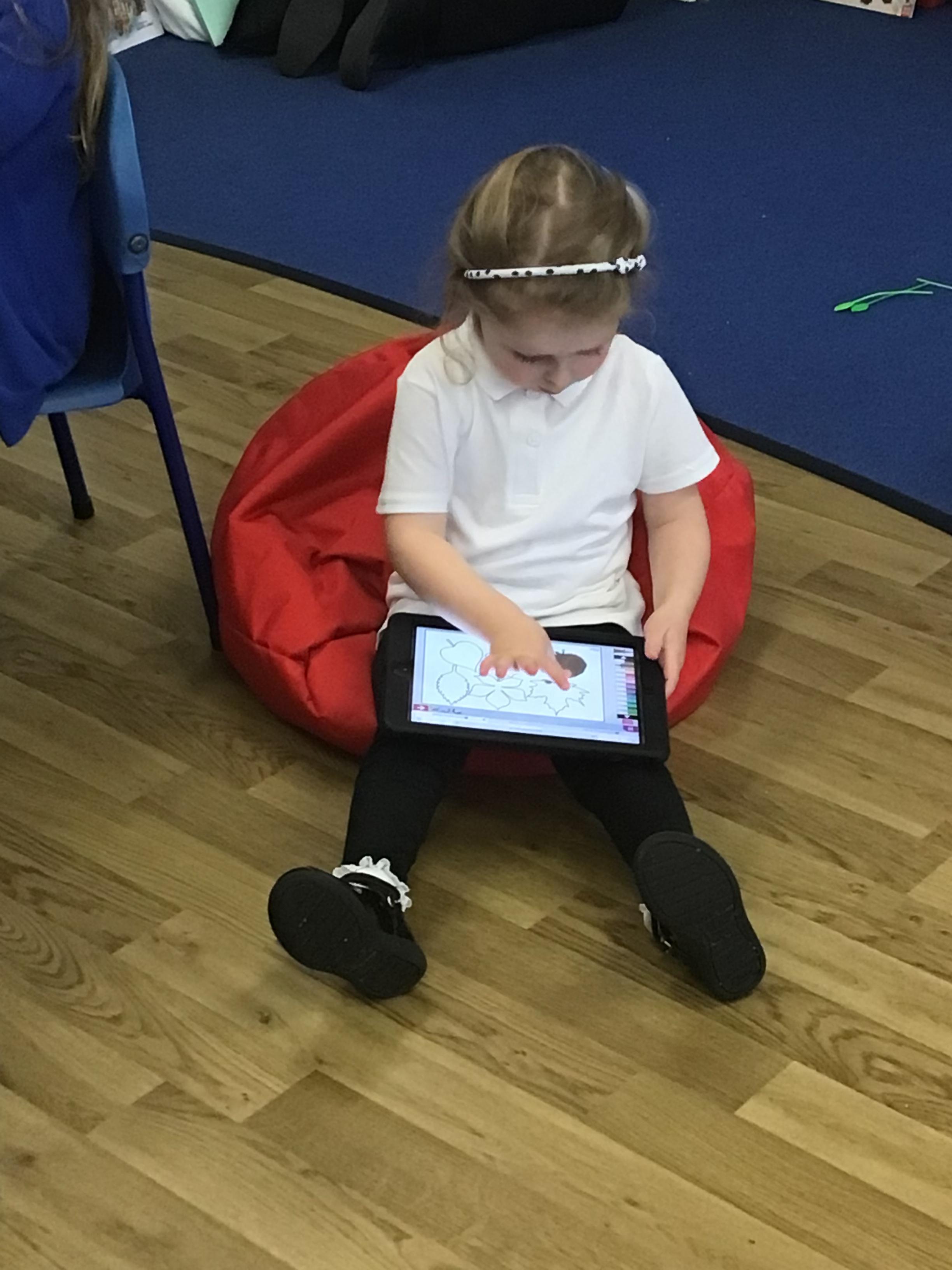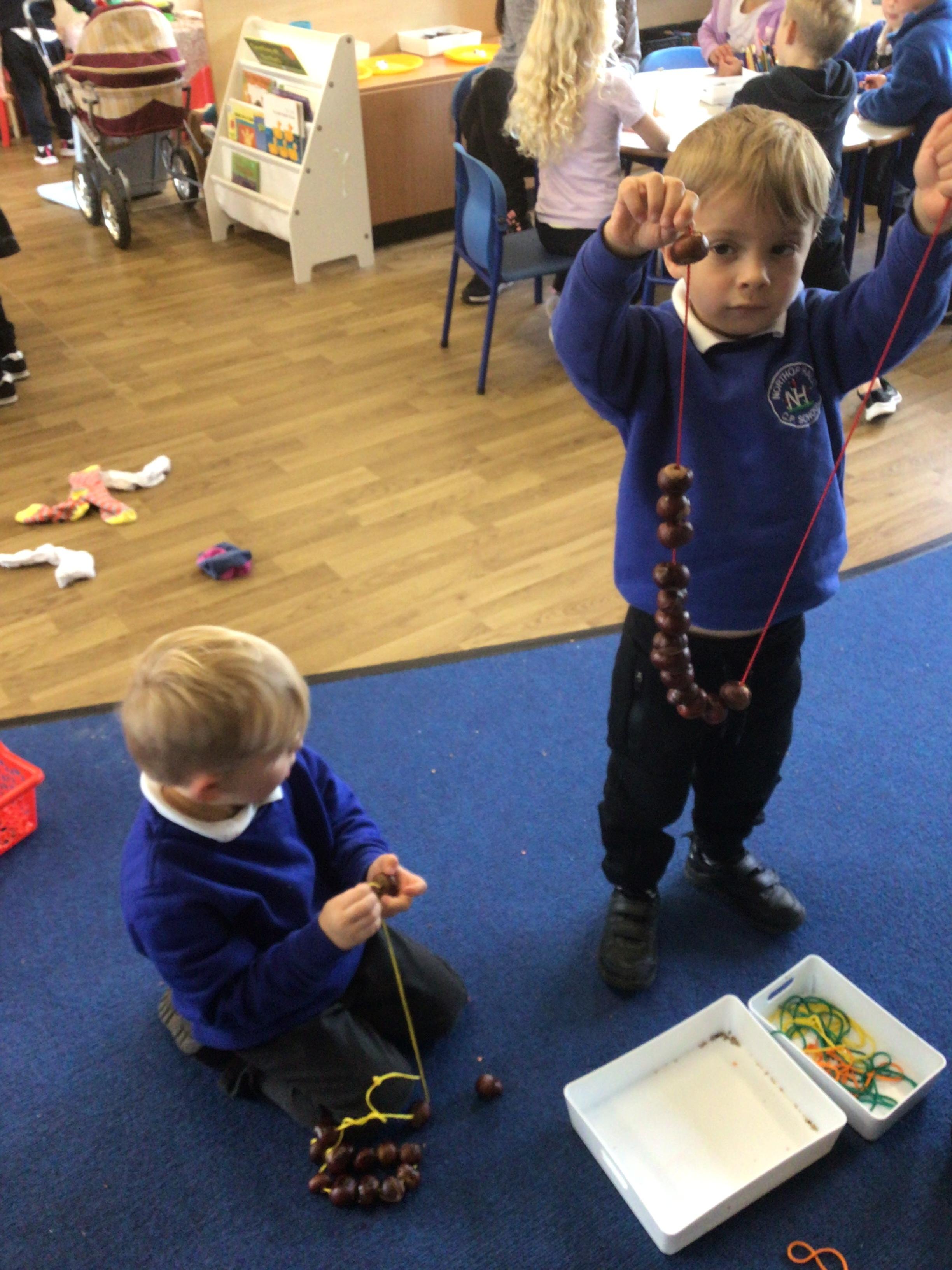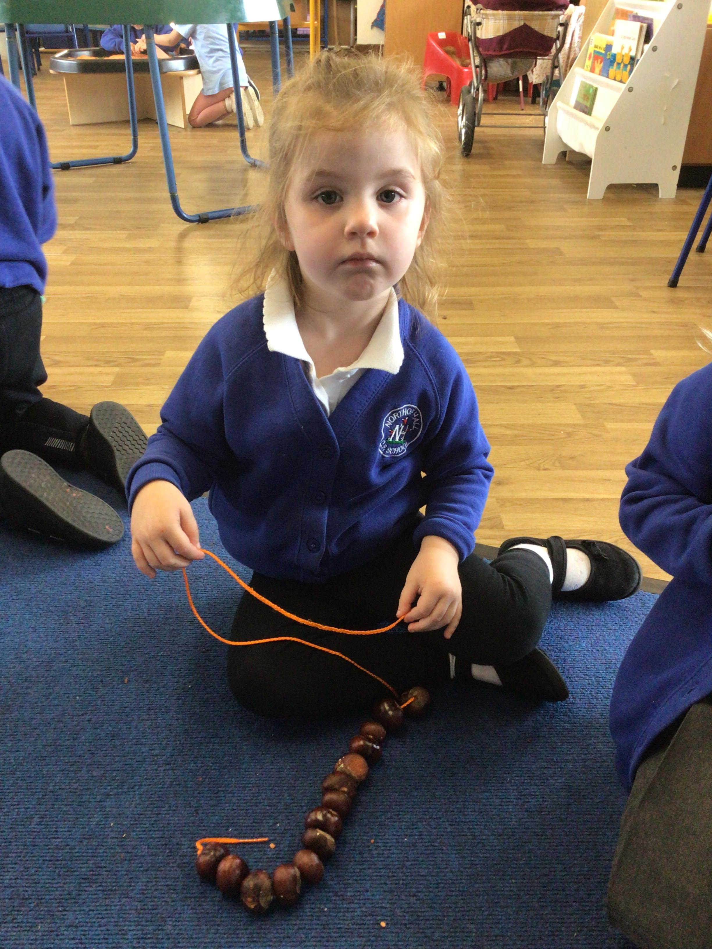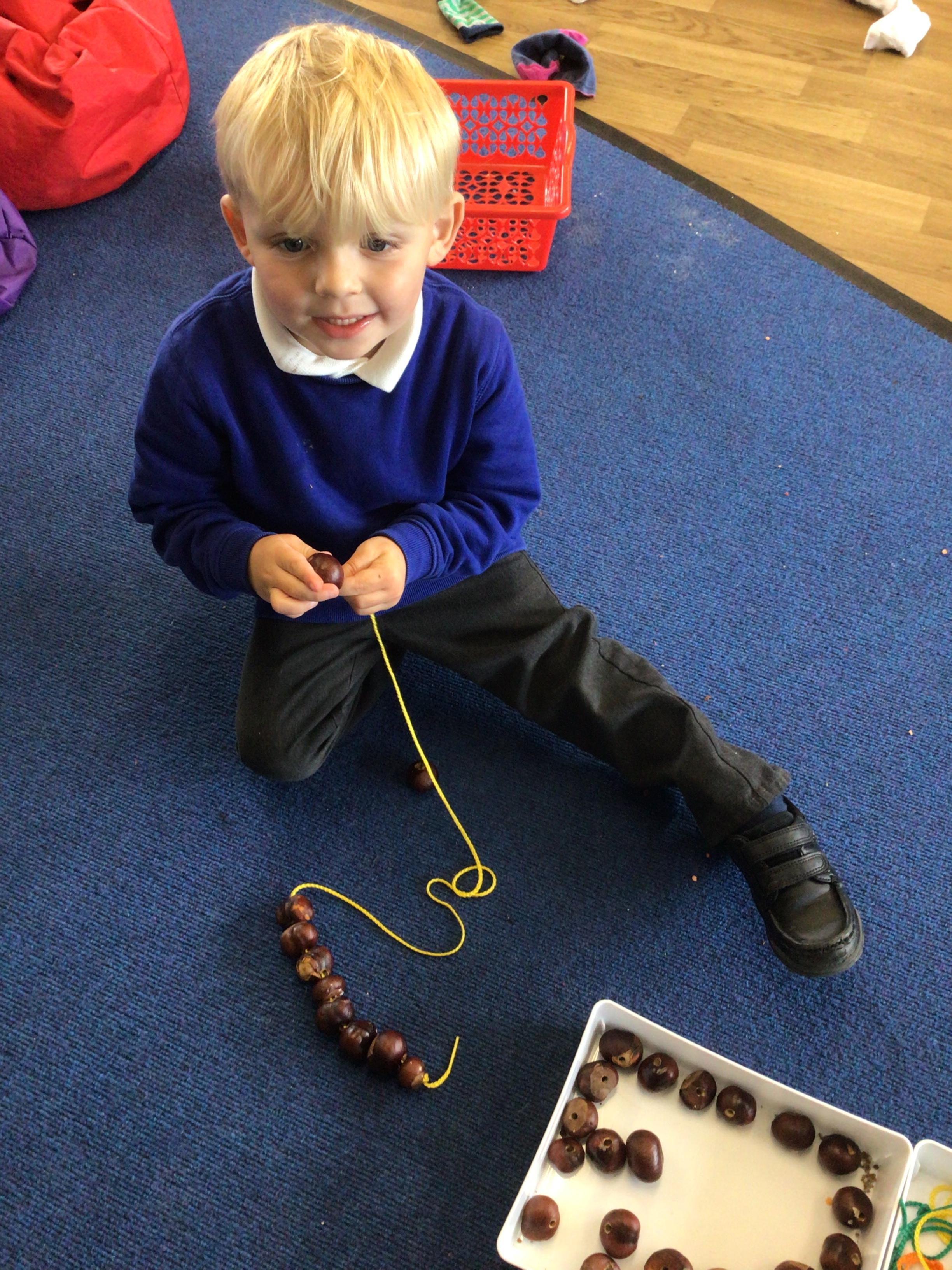 W/c 17th October: This week (and a few from last week) in Nursery. We have been exploring the acorns, conkers and ‘helicopters’ in the autumn tray, playing in the oats instead of sand, using the iPads to colour autumn leaves, making pumpkins in dough, painting autumn trees and threading conkers onto a string!