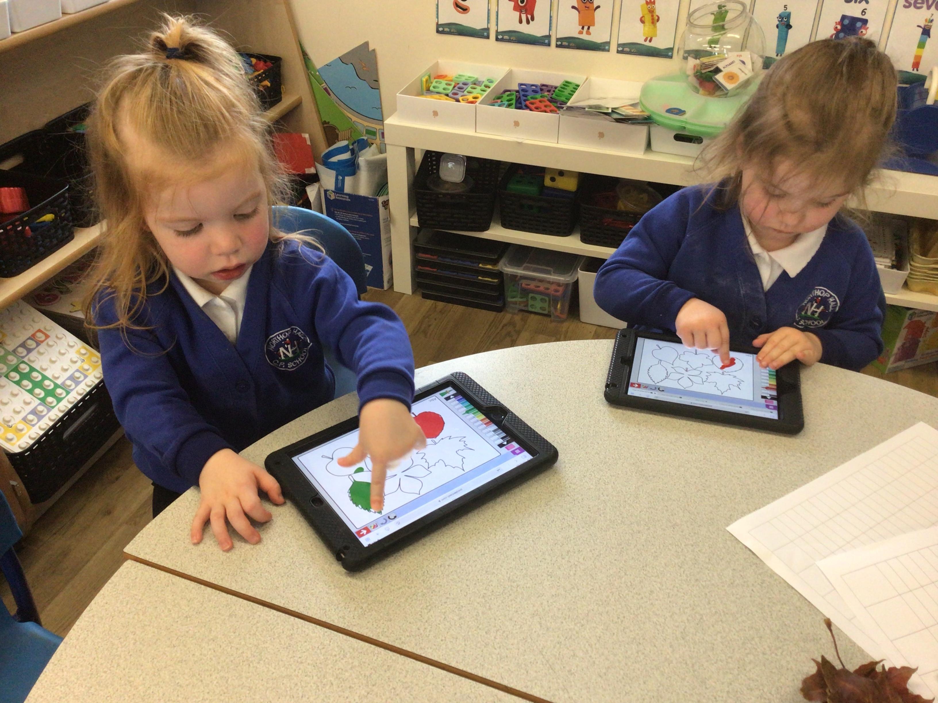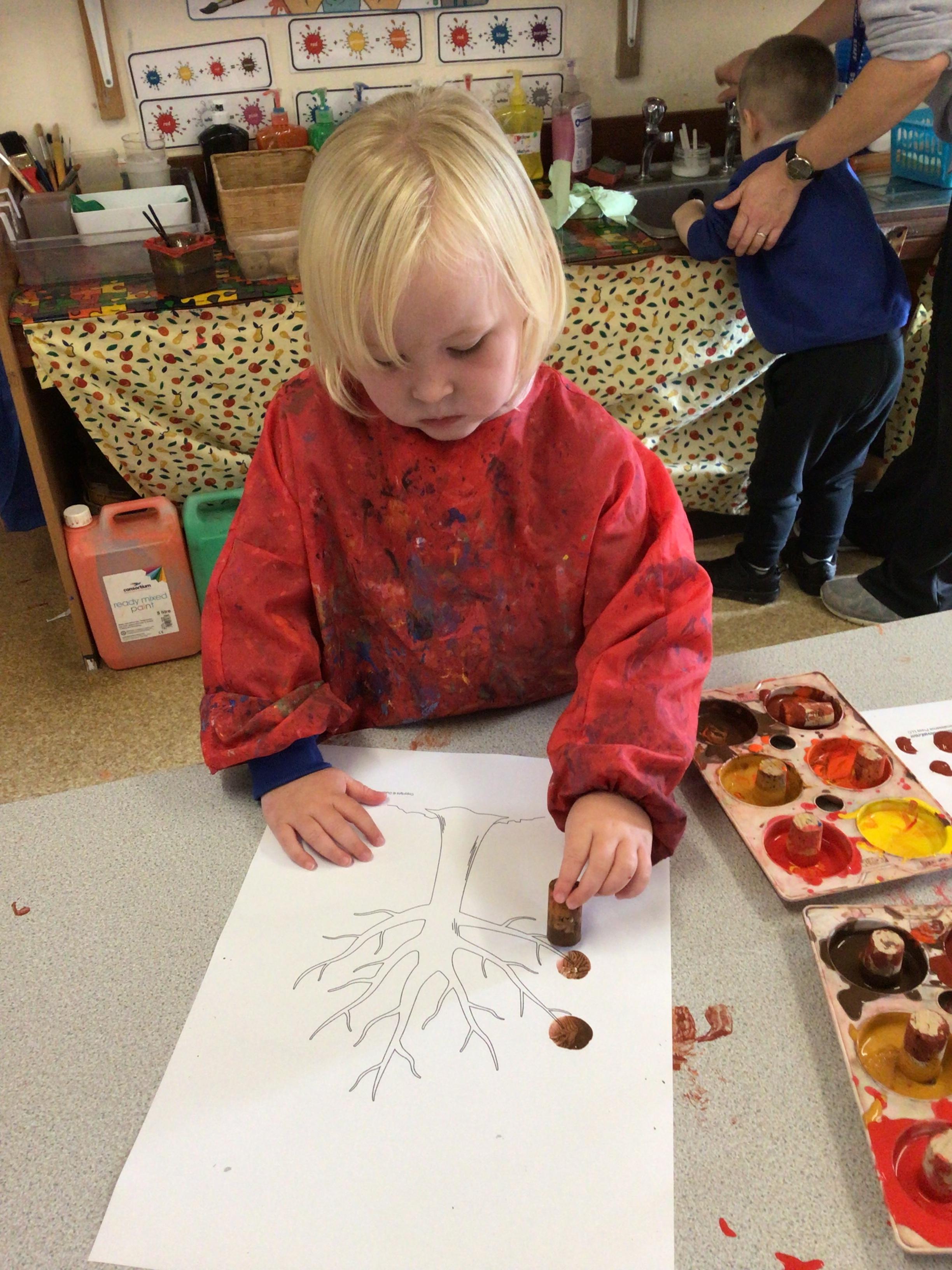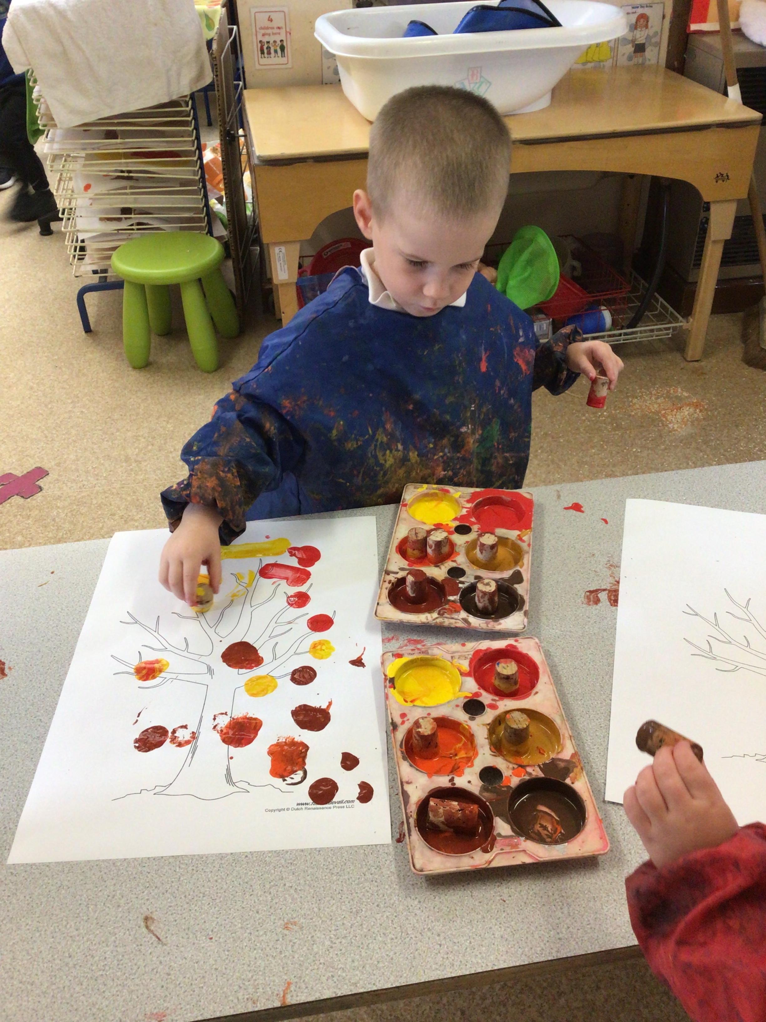 W/c 17th October: This week (and a few from last week) in Nursery. We have been exploring the acorns, conkers and ‘helicopters’ in the autumn tray, playing in the oats instead of sand, using the iPads to colour autumn leaves, making pumpkins in dough, painting autumn trees and threading conkers onto a string!