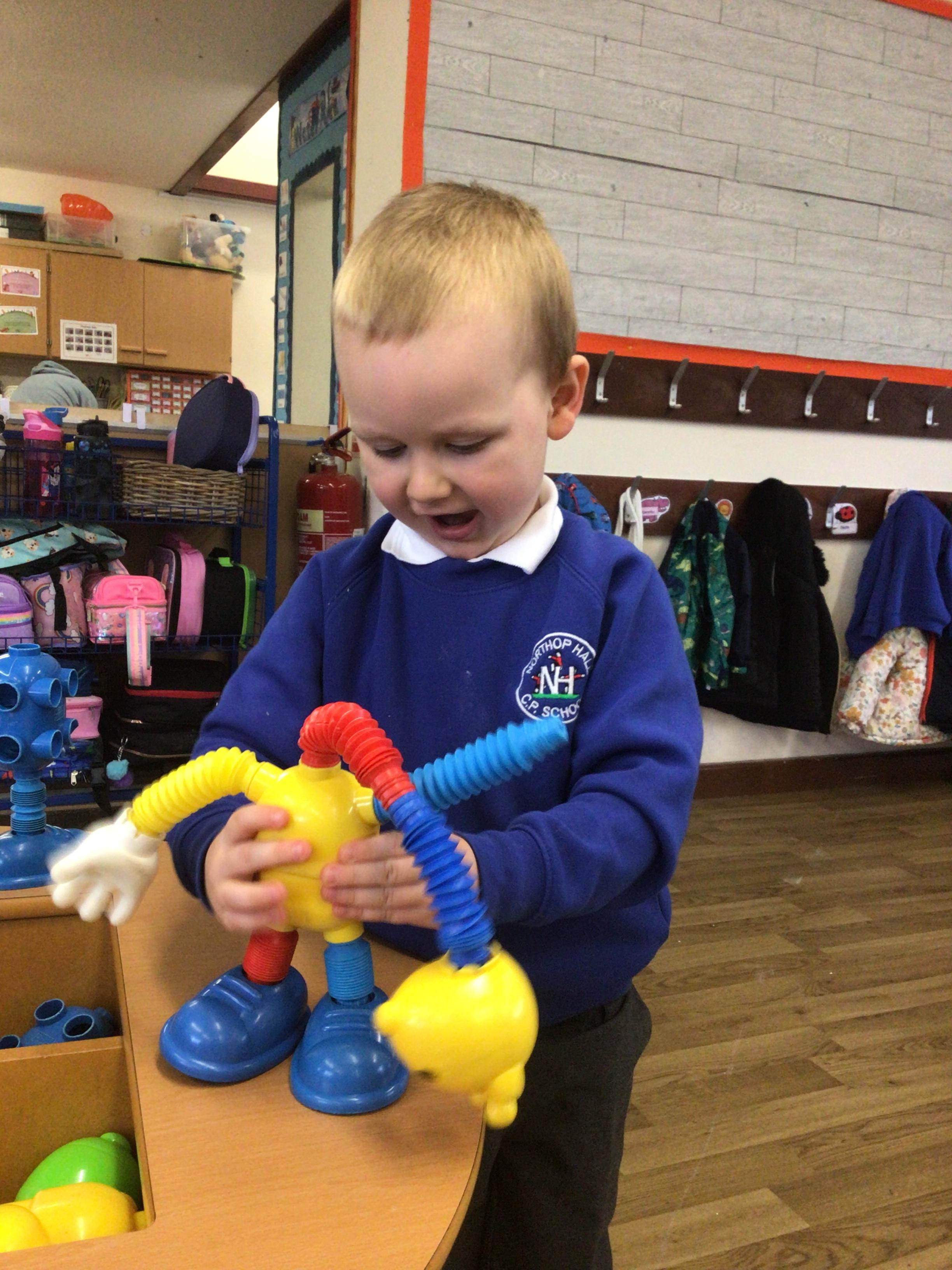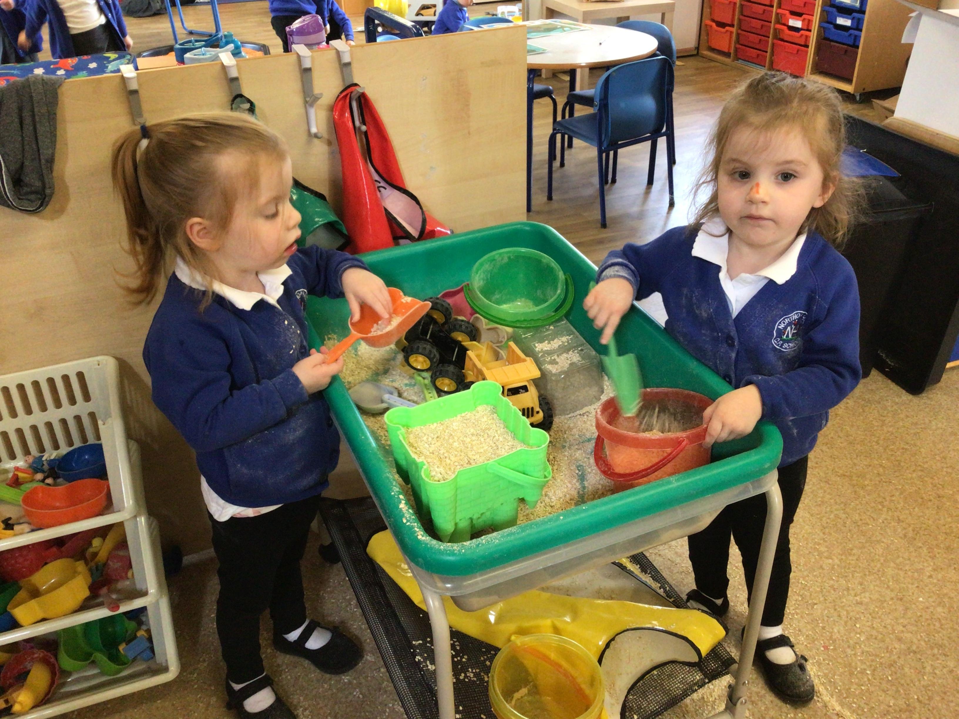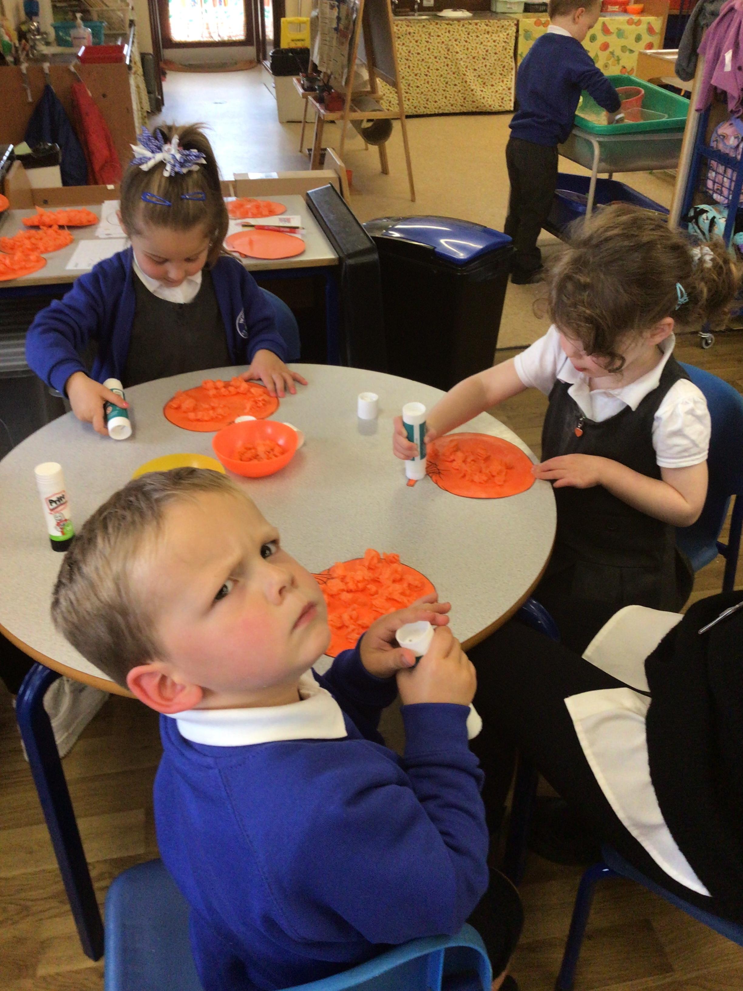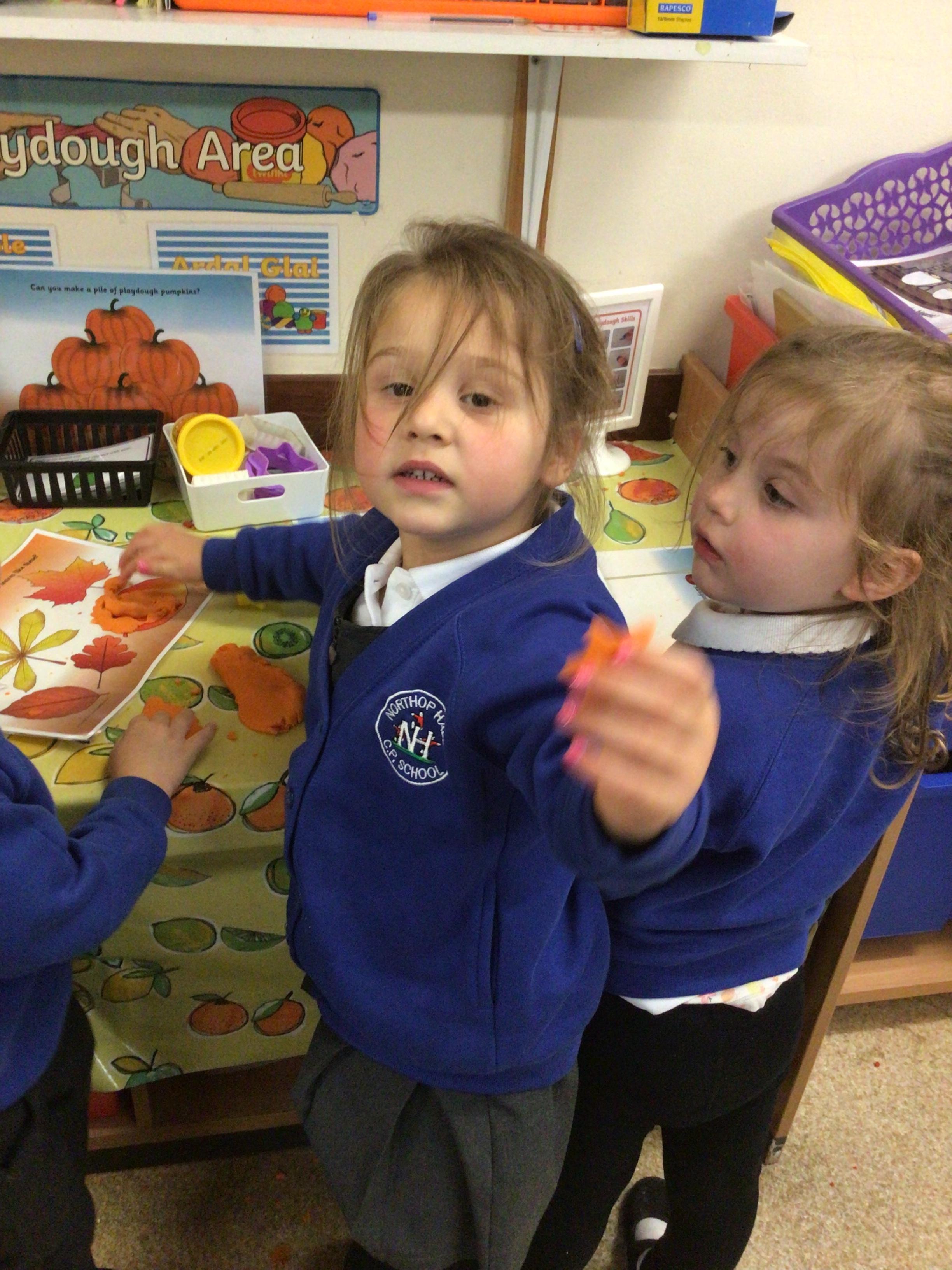 W/c 17th October: This week (and a few from last week) in Nursery. We have been exploring the acorns, conkers and ‘helicopters’ in the autumn tray, playing in the oats instead of sand, using the iPads to colour autumn leaves, making pumpkins in dough, painting autumn trees and threading conkers onto a string!