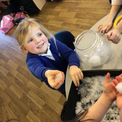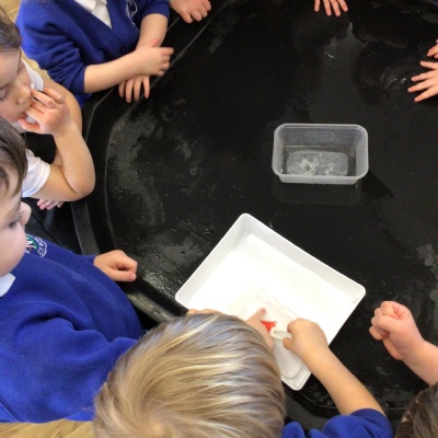 • We learnt about St Dwynwens day and in the story Maelon gets turned into a block of ice.  We explored big blocks of ice in the water tray.
