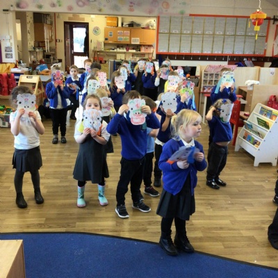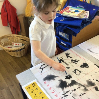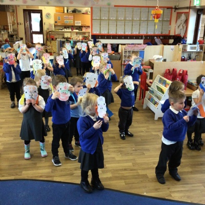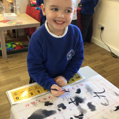 • We celebrated Chinese New Year by doing a traditional lion dance with our lion masks. We also had a go at writing some Chinese symbols and using chopsticks.
