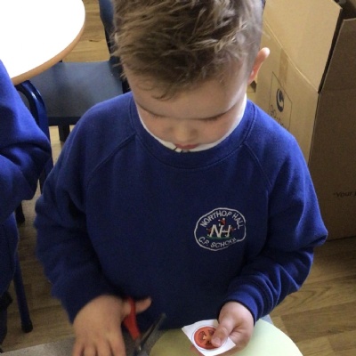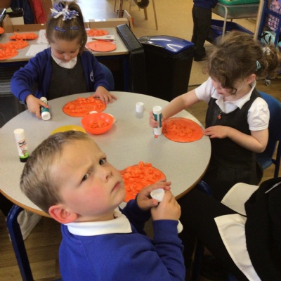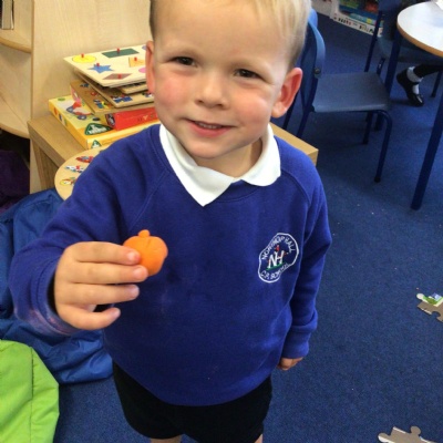 We have had another busy week in Nursery.  Our colour this week was yellow and we went on a yellow hunt. We have been singing Autumn songs, we collected leaves for leaf rubbings and we made a pumpkin.