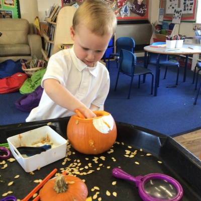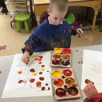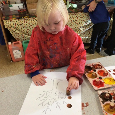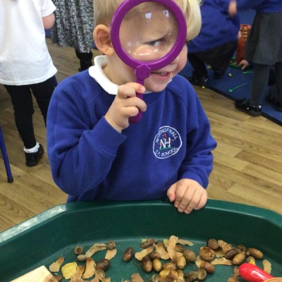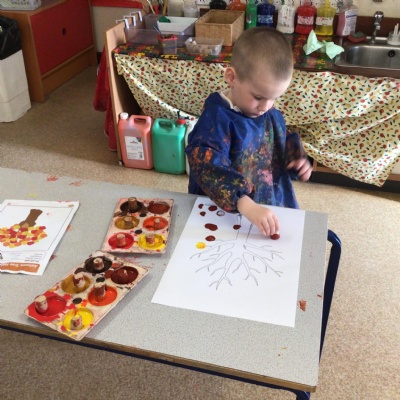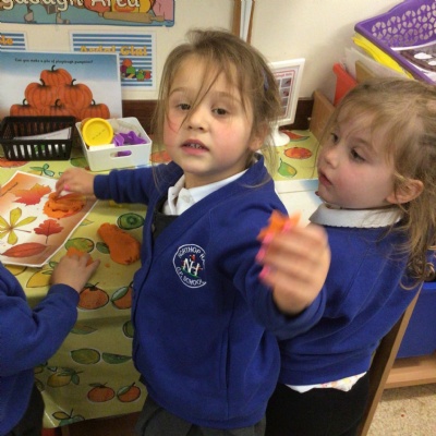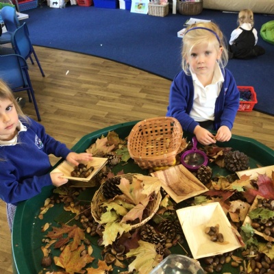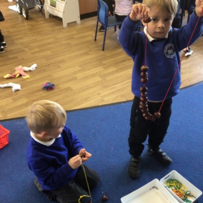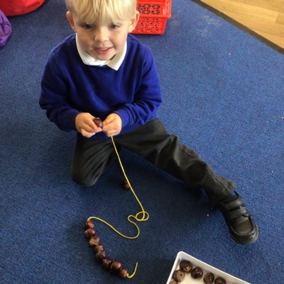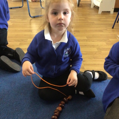 W/c 17th October: This week (and a few from last week) in Nursery. We have been exploring the acorns, conkers and ‘helicopters’ in the autumn tray, playing in the oats instead of sand, using the iPads to colour autumn leaves, making pumpkins in dough, painting autumn trees and threading conkers onto a string!