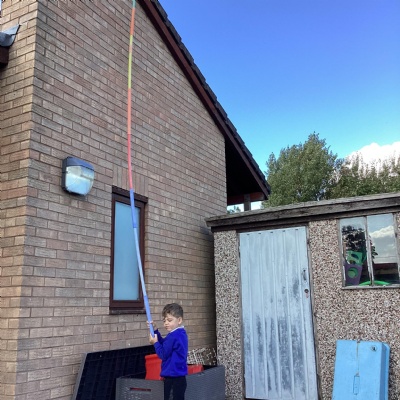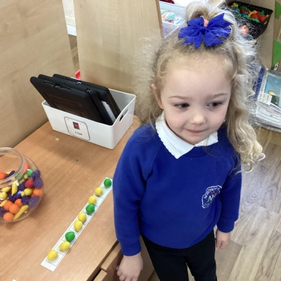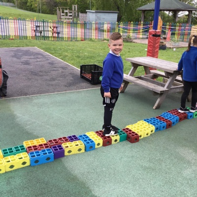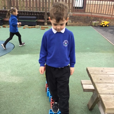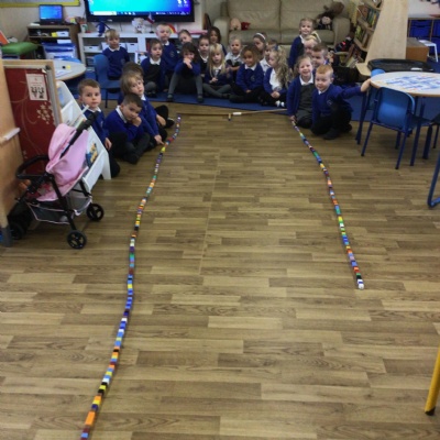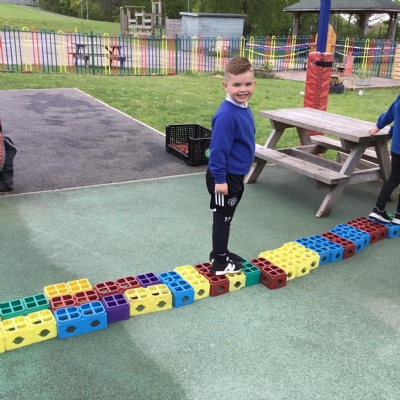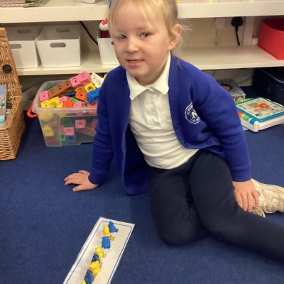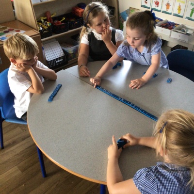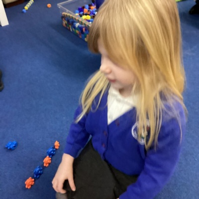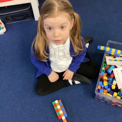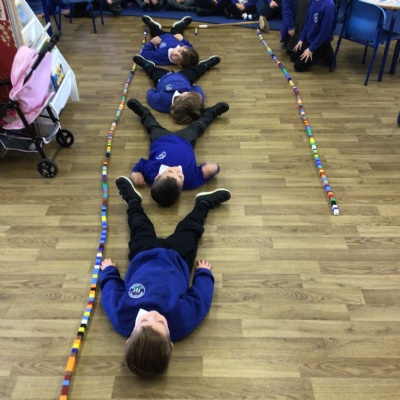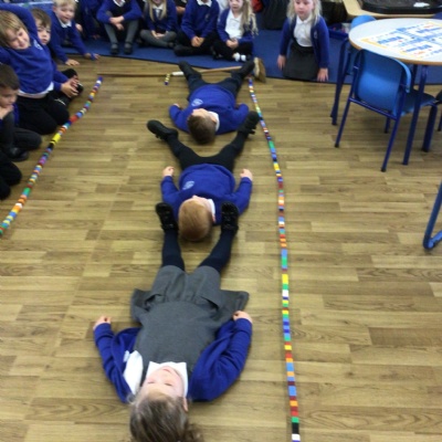 We made long snakes with the cubes and measured them using ourselves!  One snake was 3 children long and the other was 4 children long.  We also found sticks outside and compared their length using “longer than” and “shorter than”.