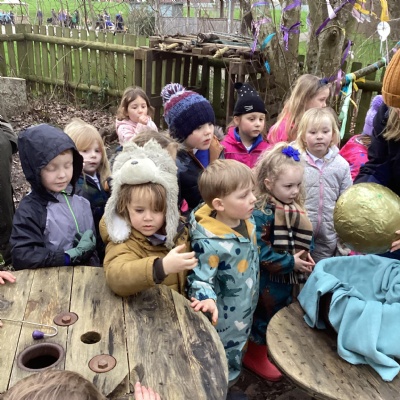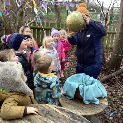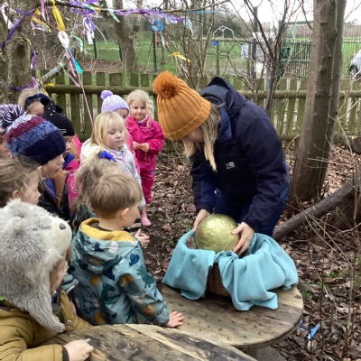 We found a mysterious large golden egg in the forest in a nest of leaves. We looked around the area to see if we could find any clues.  We carefully put it in a basket and brought it inside because of the cold weather. We wondered what type of egg it could be. Our thoughts are that it could be an ostrich, dinosaur, dragon, golden goose or even a chocolate egg! We looked at these types of eggs on the internet and we think it could be a dragon's egg.