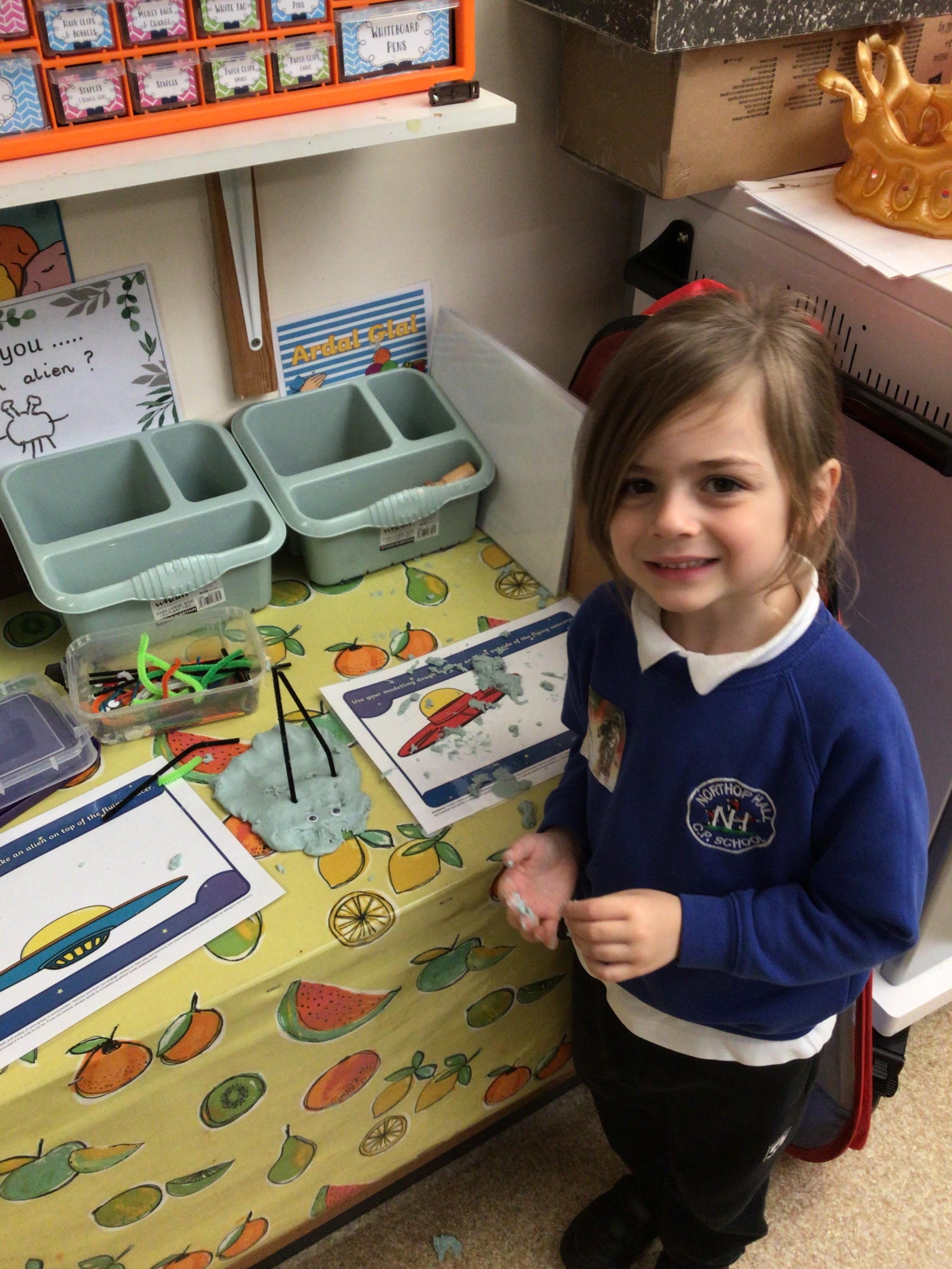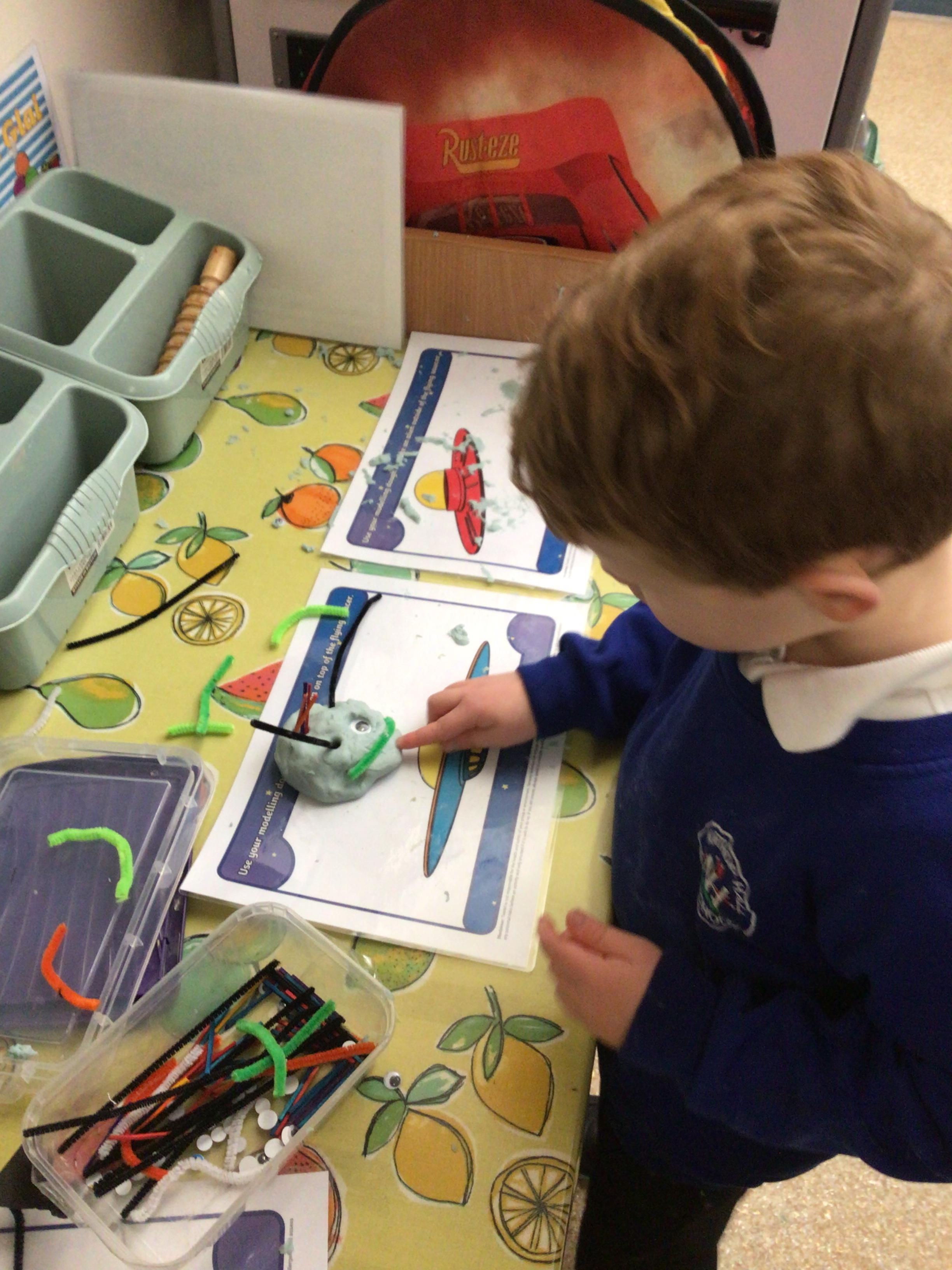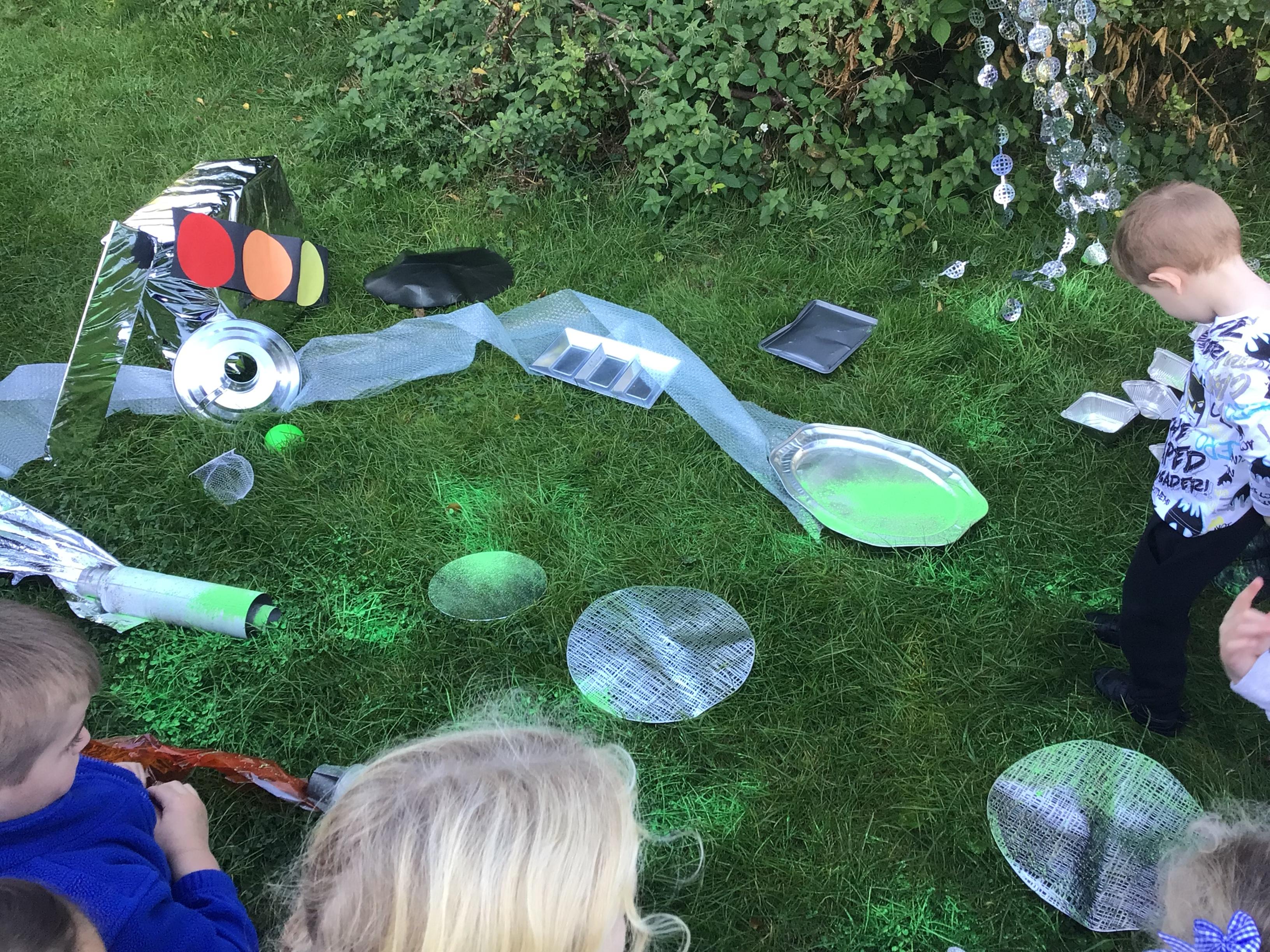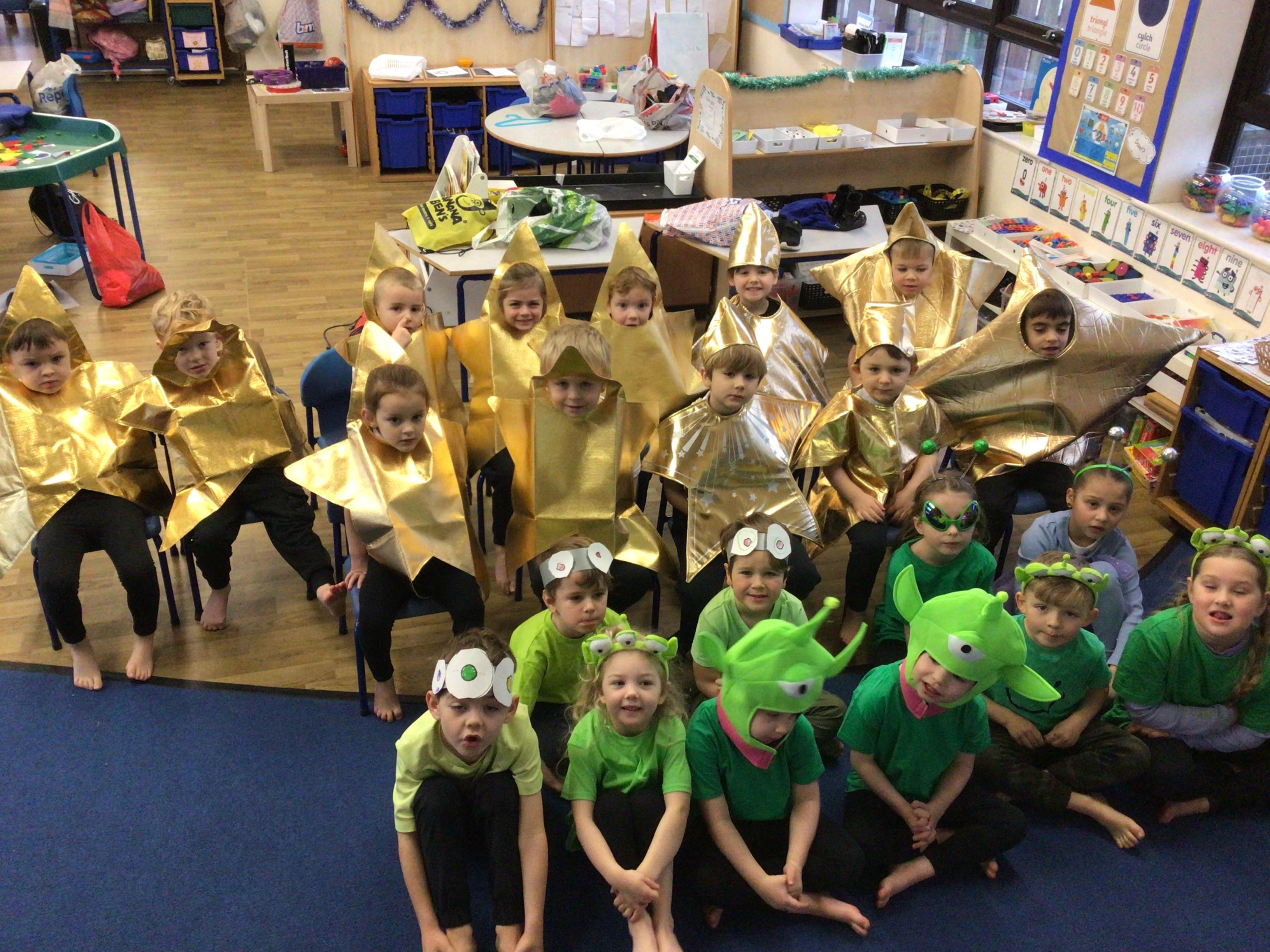 We have enjoyed learning through our Space topic. We learnt a poem ‘The Alien,’ with actions, and we annotated the poem to make it our own. We have completed lots of activities, including designing and making our own aliens, creating aliens in the dough, painting aliens, making spaceships and rockets in the construction area, counting and sorting in the water tray, making alien jelly, and of course, performing as aliens and stars in our production of ‘Christmas with the aliens!’