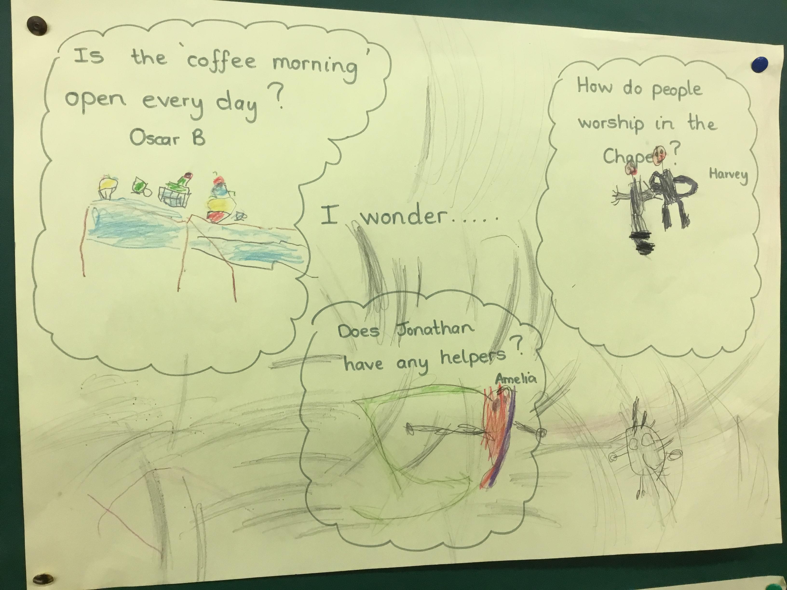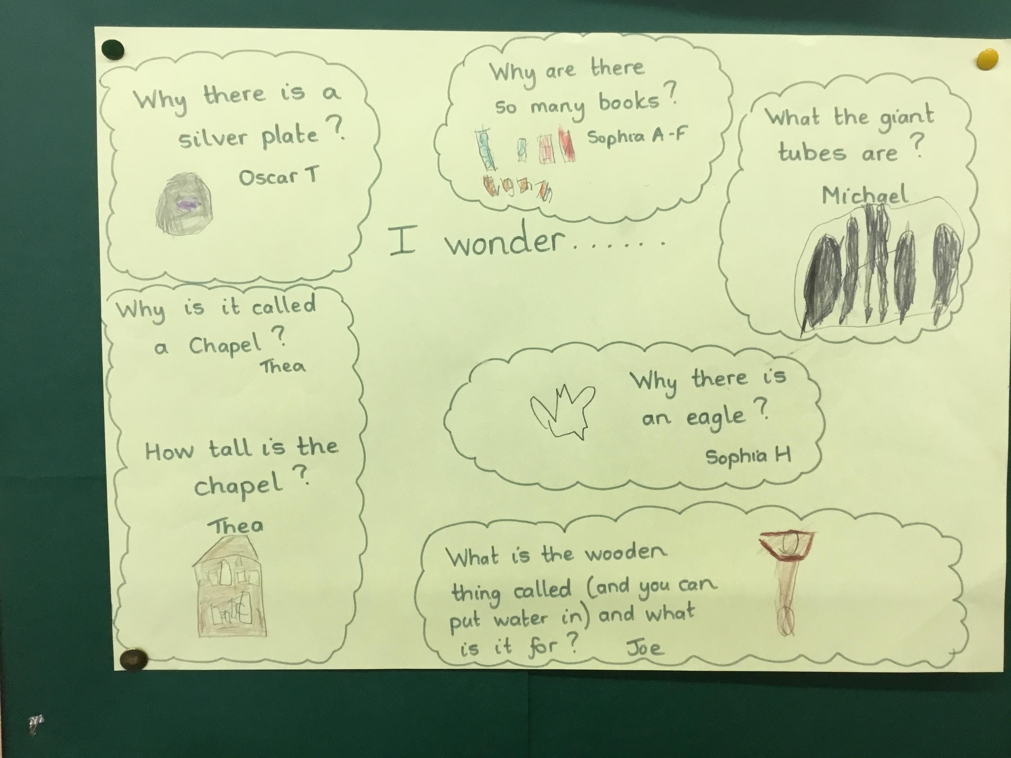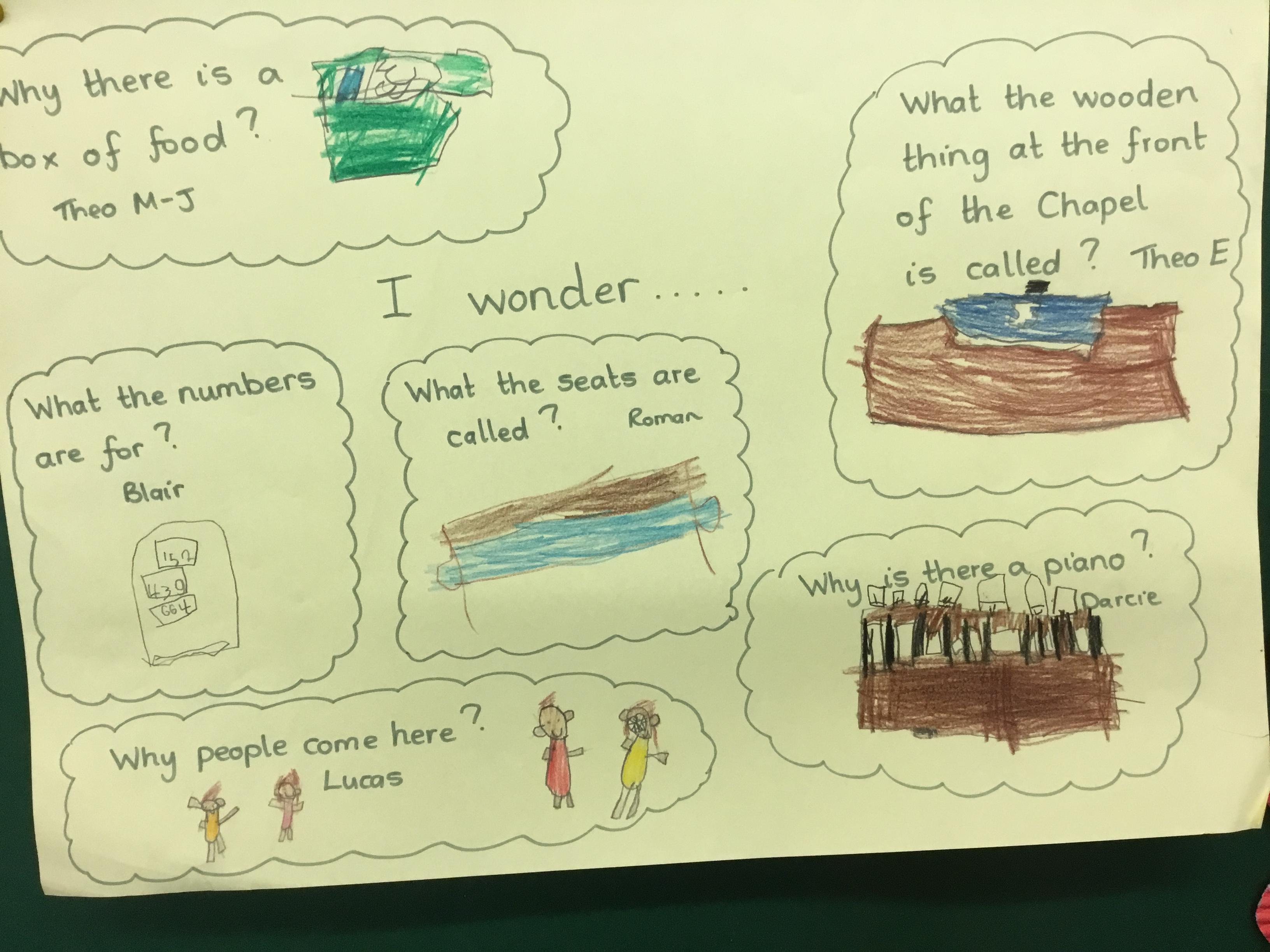 In our class assemblies we learnt about what worship is and where people worship. We arranged to visit the Presbyterian Church (Chapel). The children explored inside and asked lots and lots of questions! Back in school we organised our ‘I wonder ......’ questions.