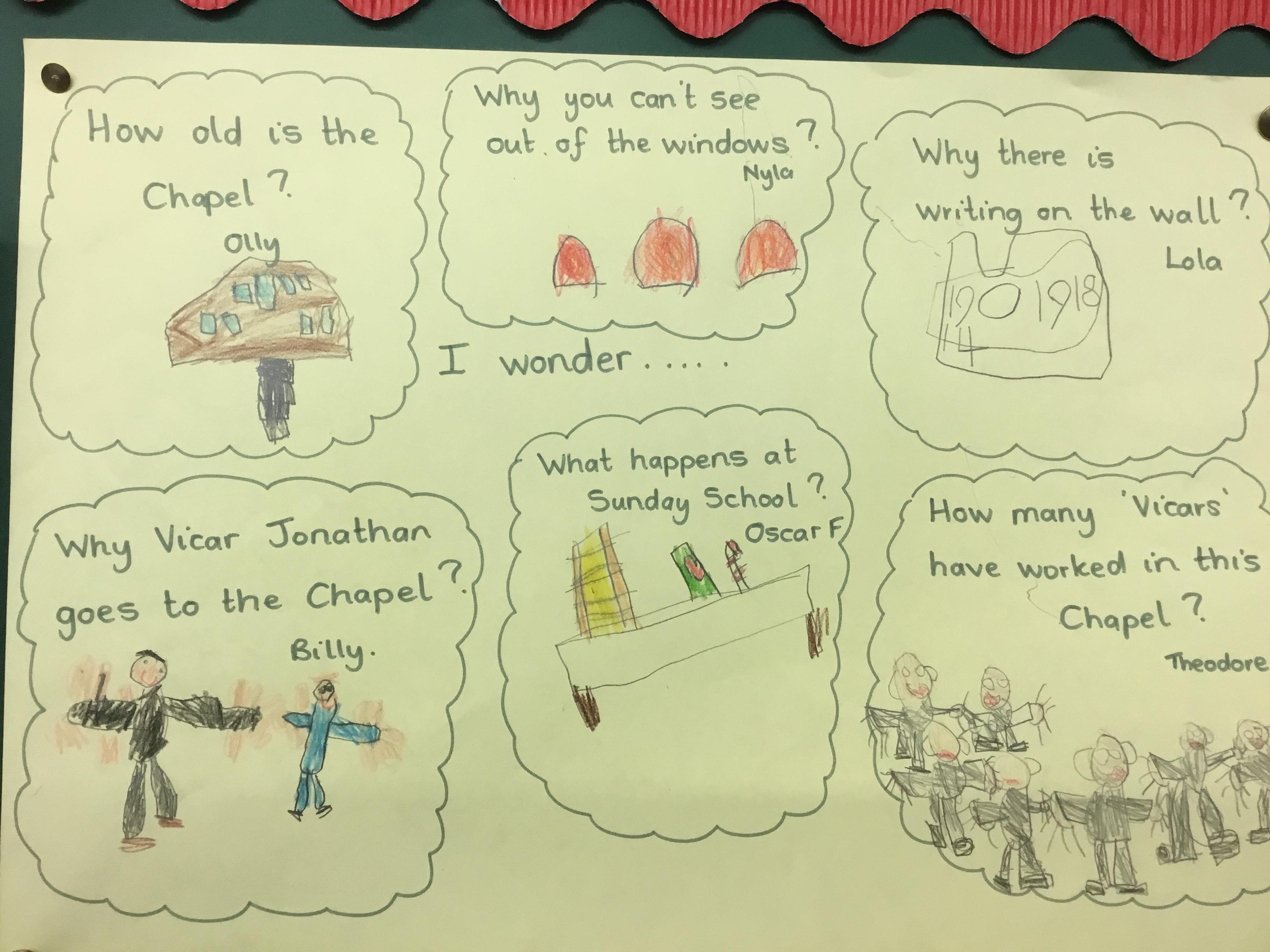 In our class assemblies we learnt about what worship is and where people worship. We arranged to visit the Presbyterian Church (Chapel).  The children explored inside and asked lots and lots of questions! Back in school we organised our ‘I wonder ......’ questions.