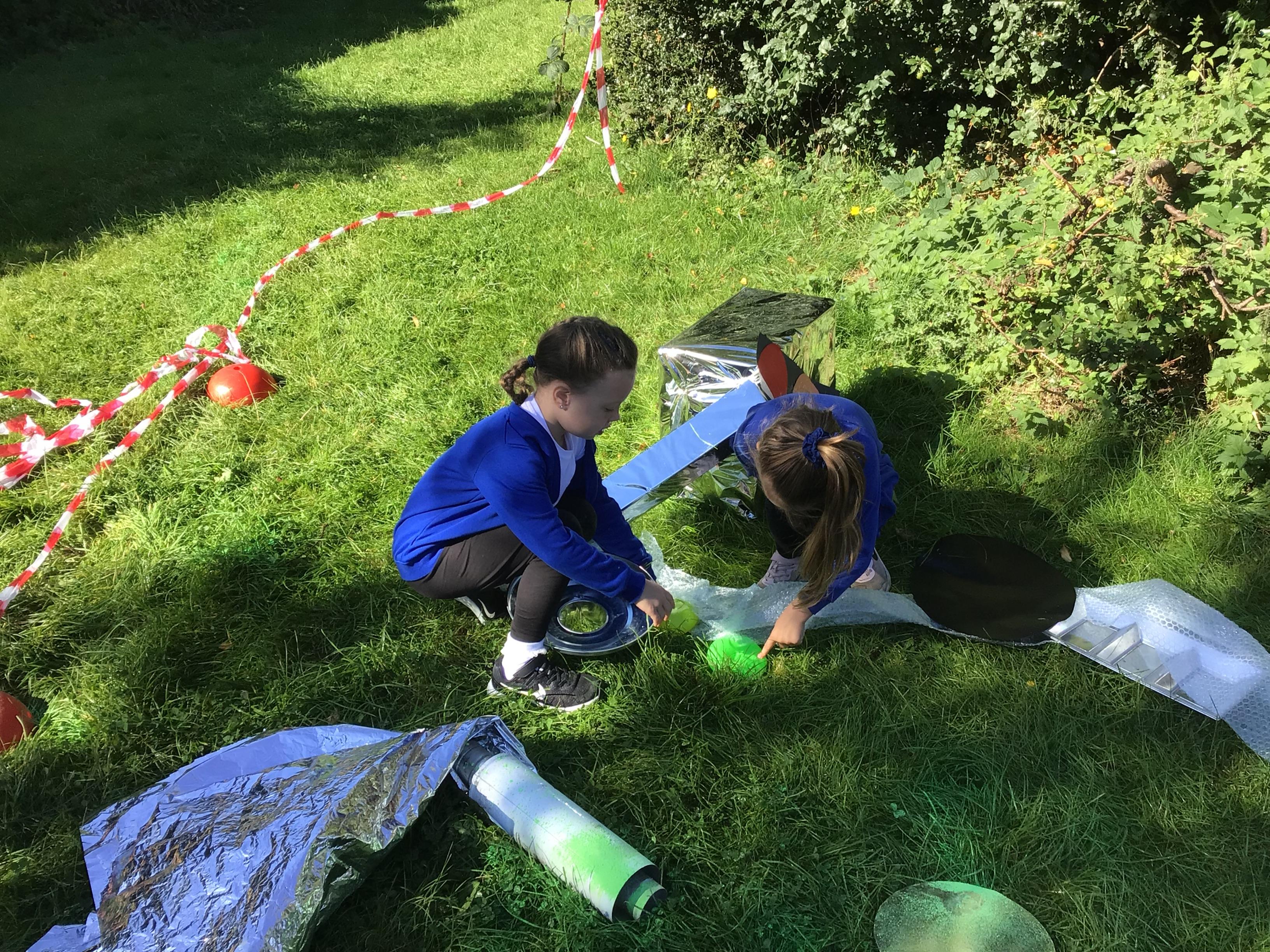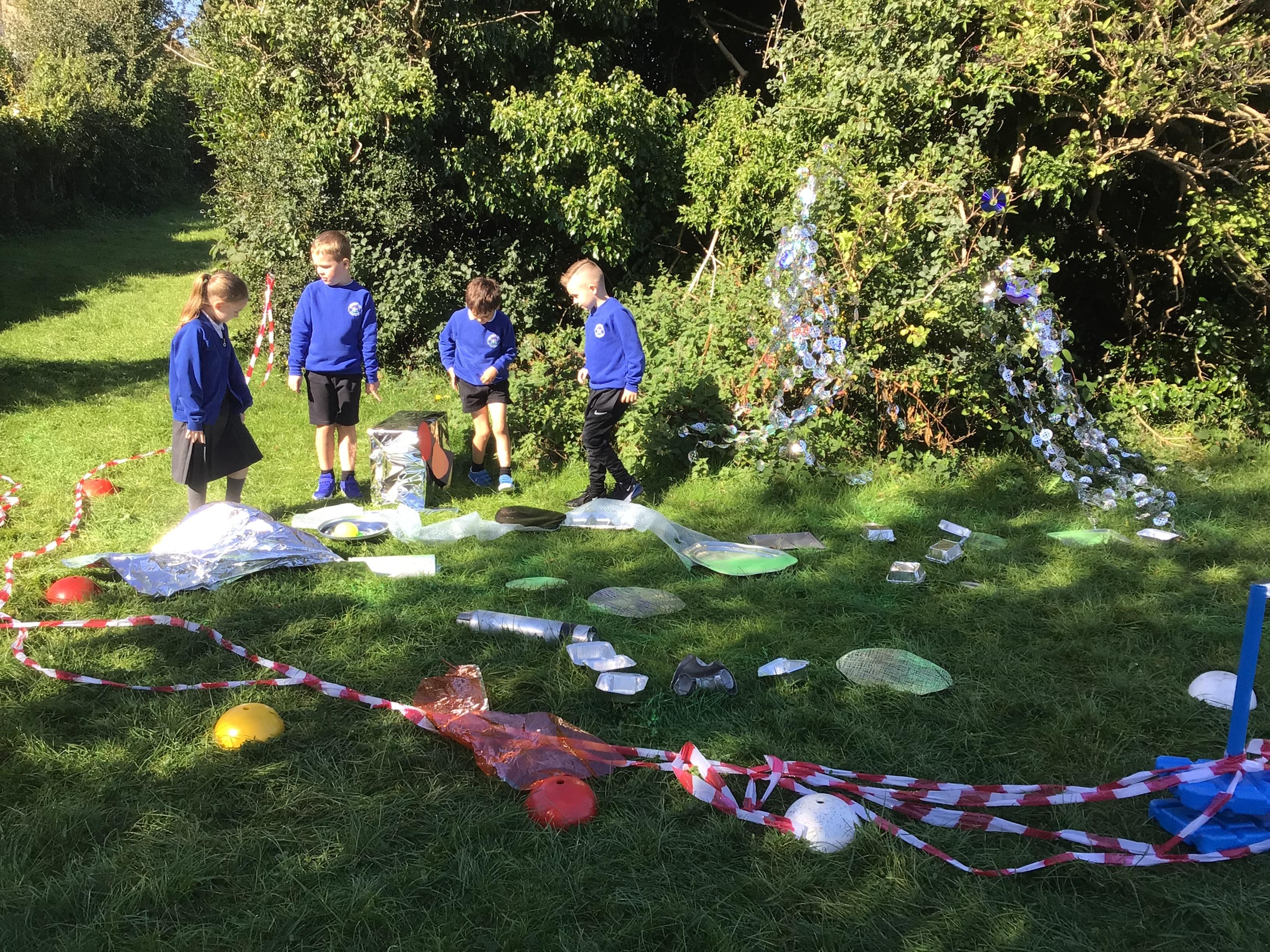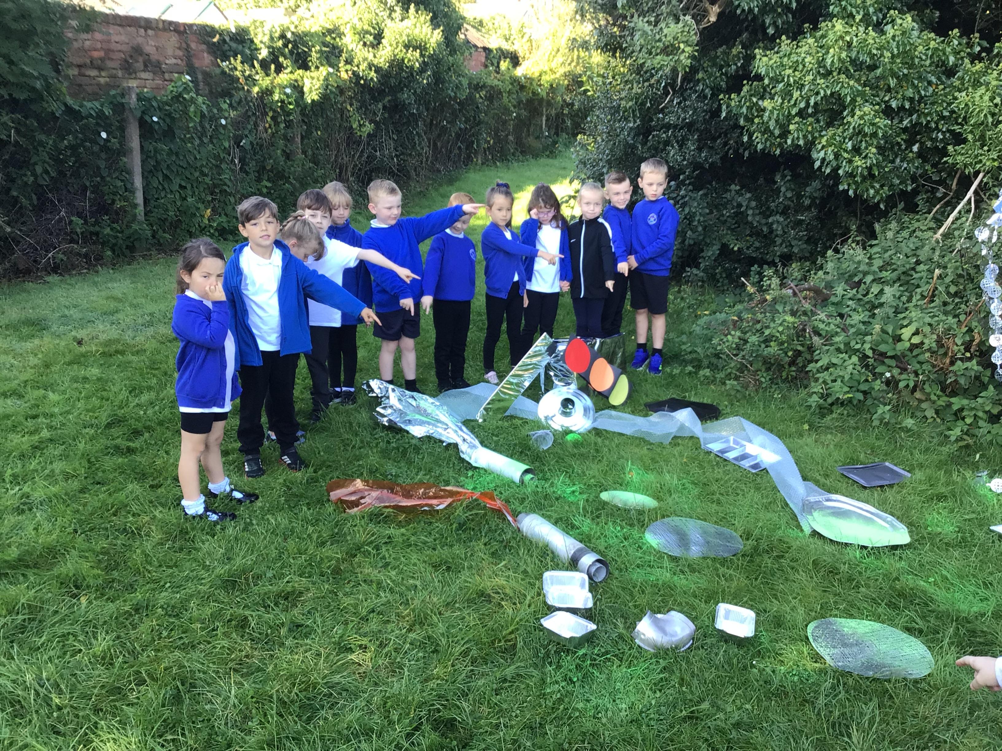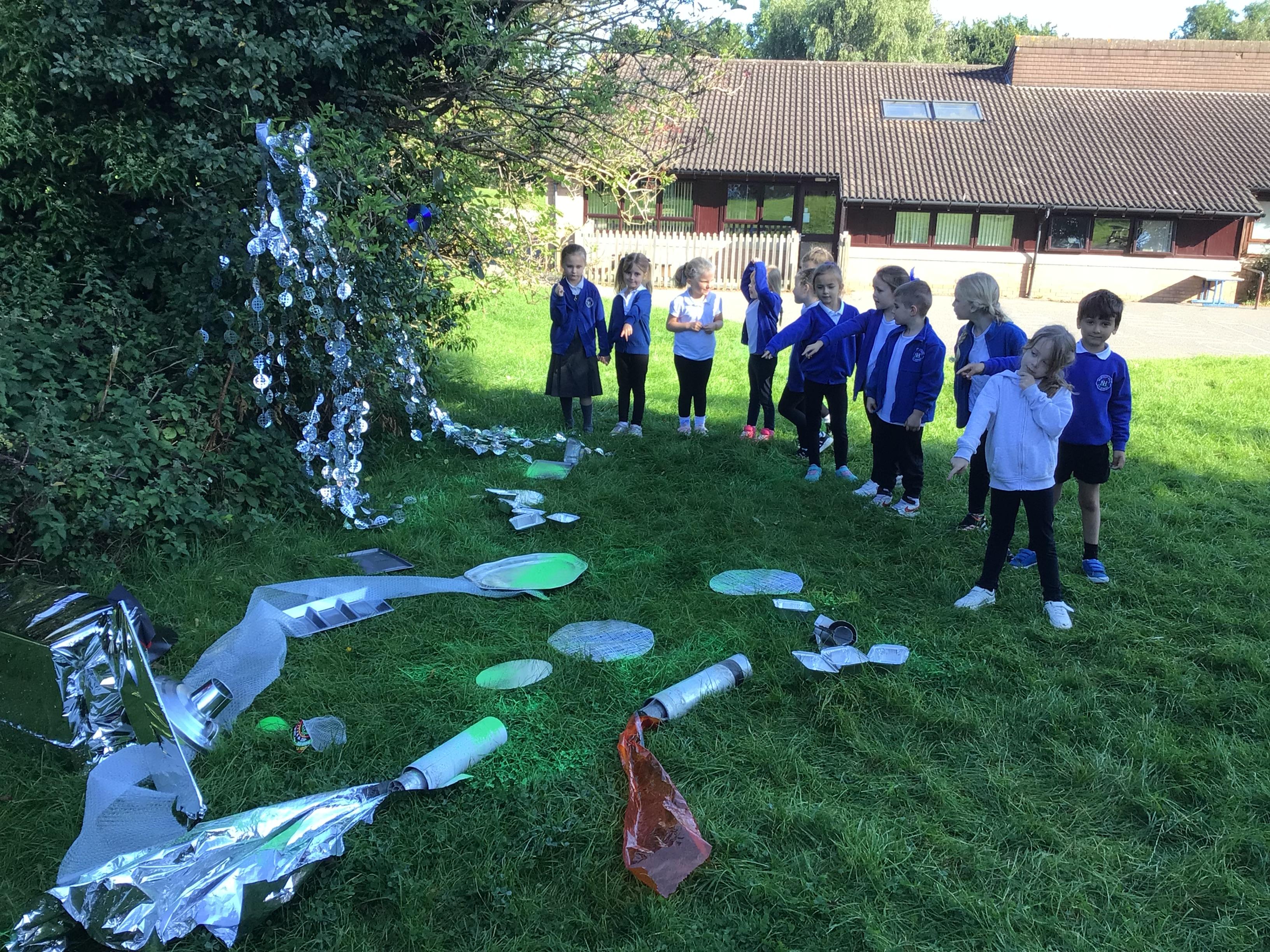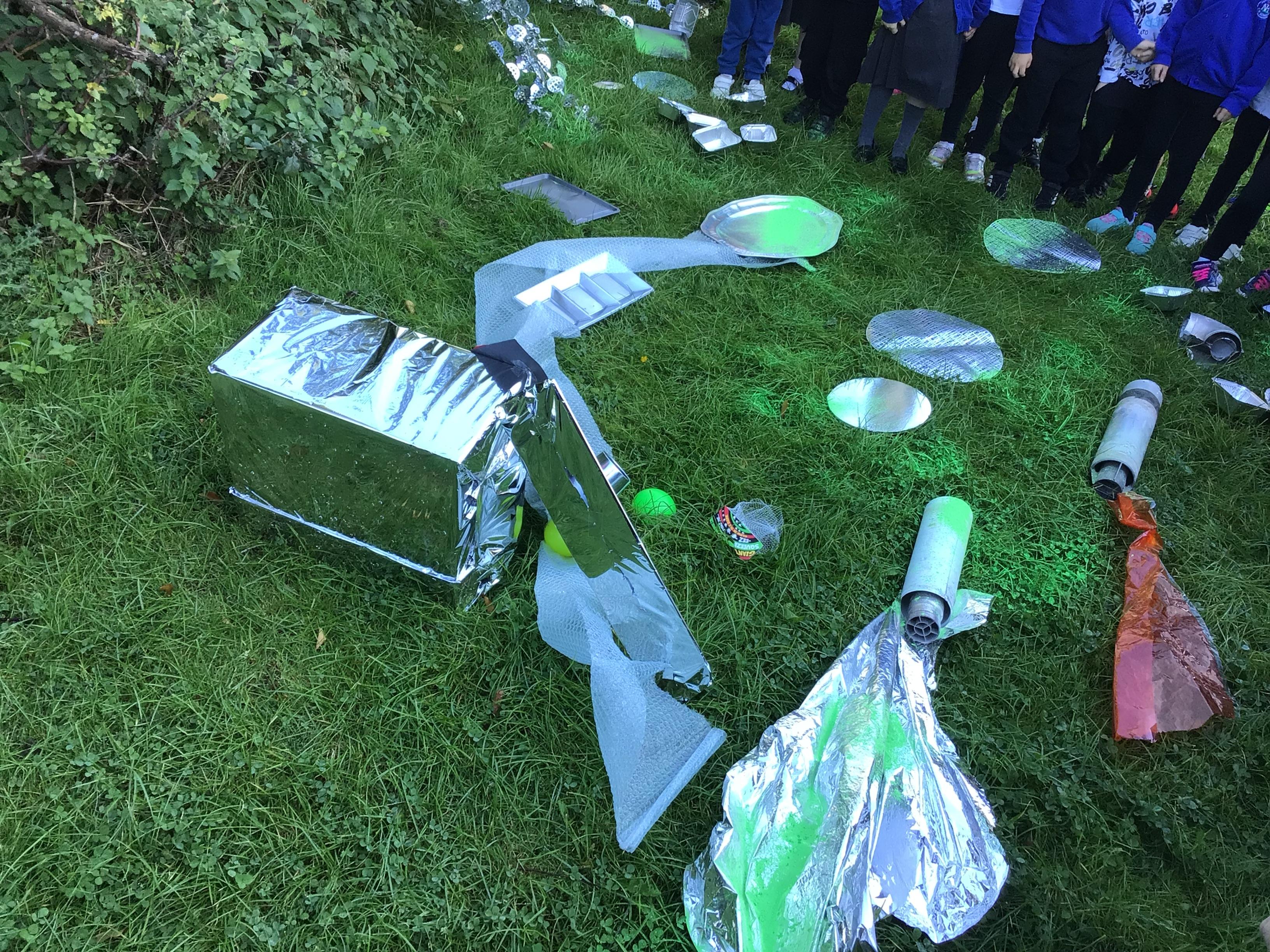 After receiving inquiries about flashing lights and mysterious noises, we went to investigate and couldn’t believe what we found! A spaceship had crash landed on our school field!!! There were pieces of spaceship spread all over and we even found some green space dust and slime!