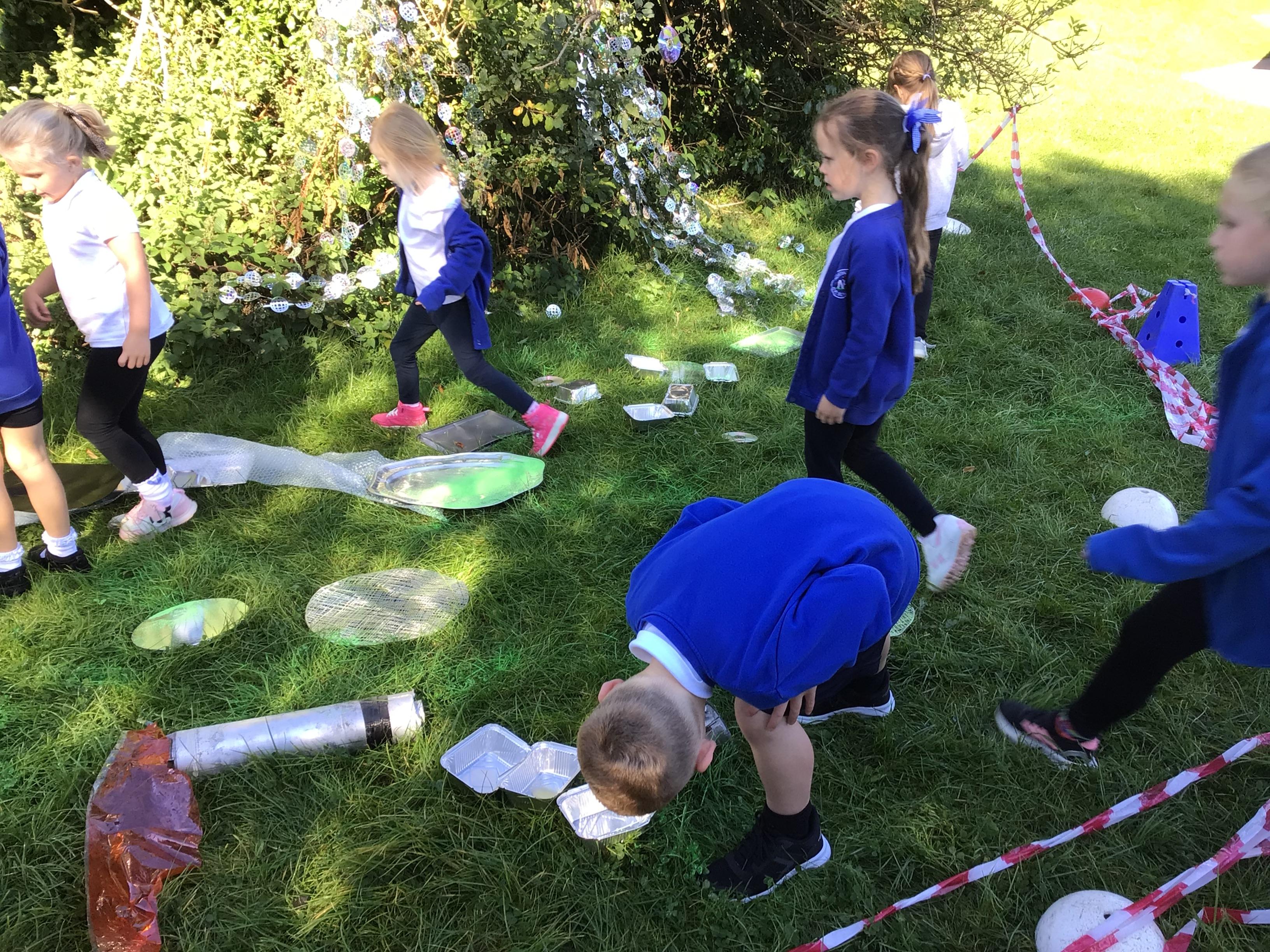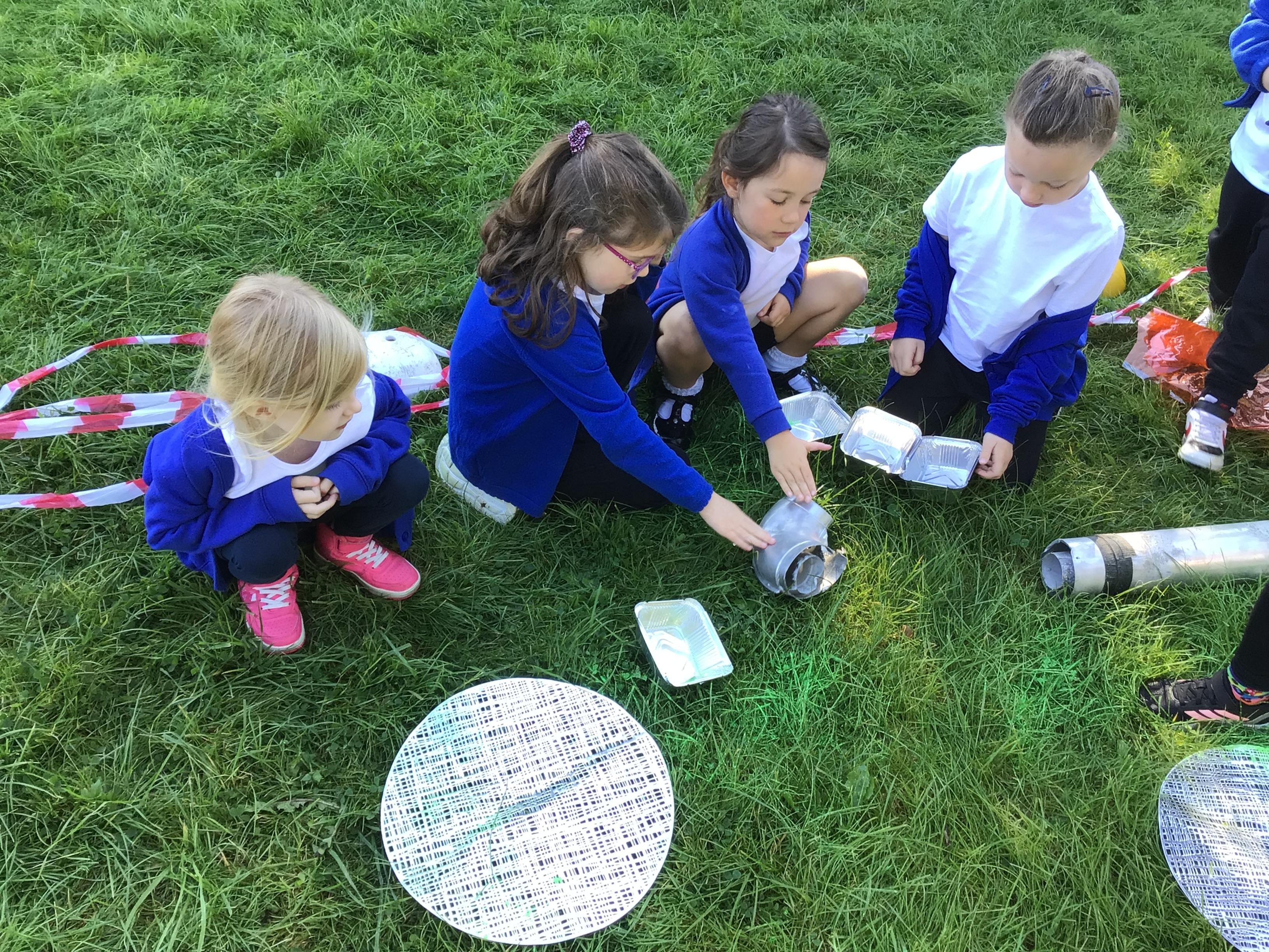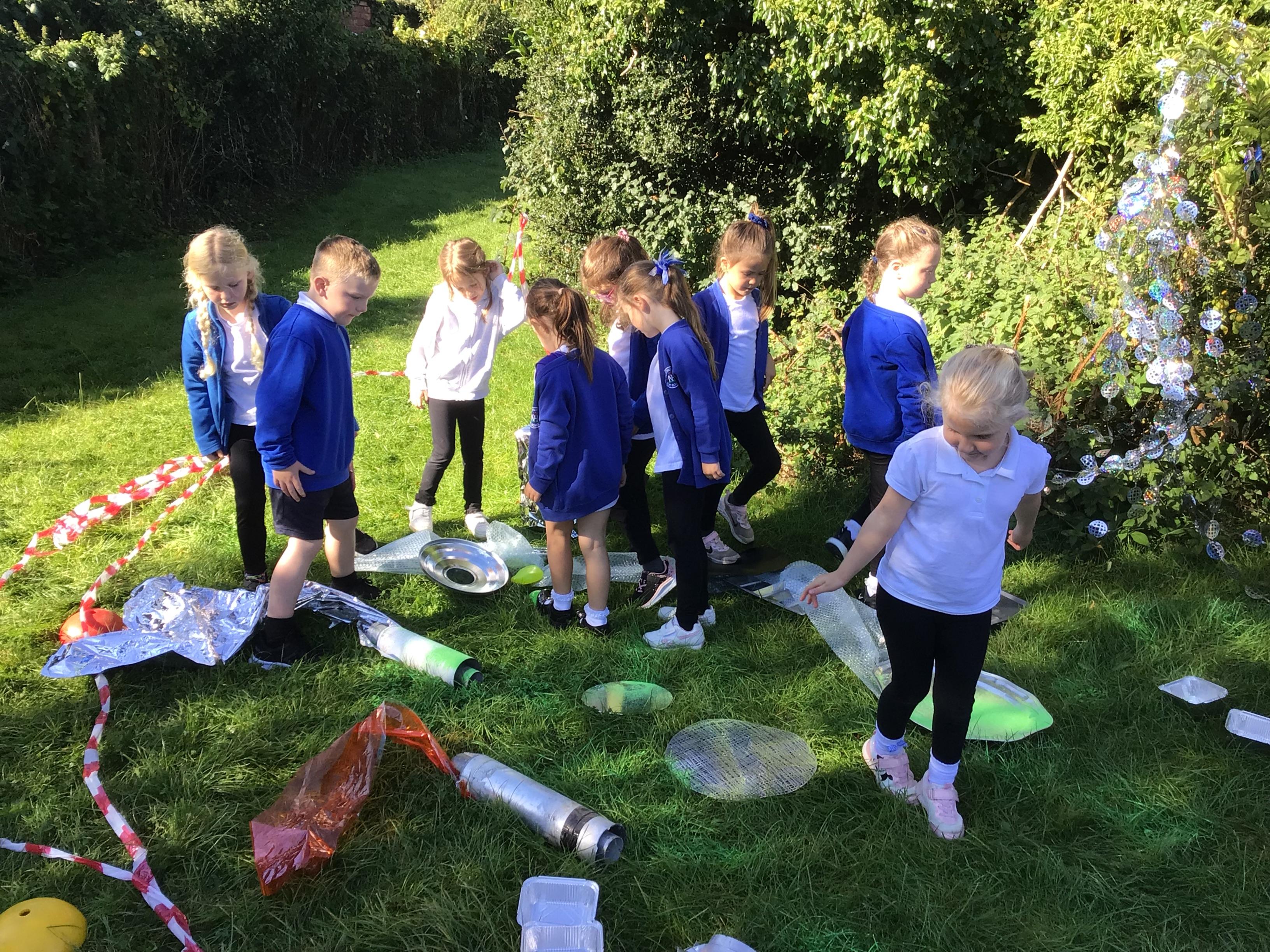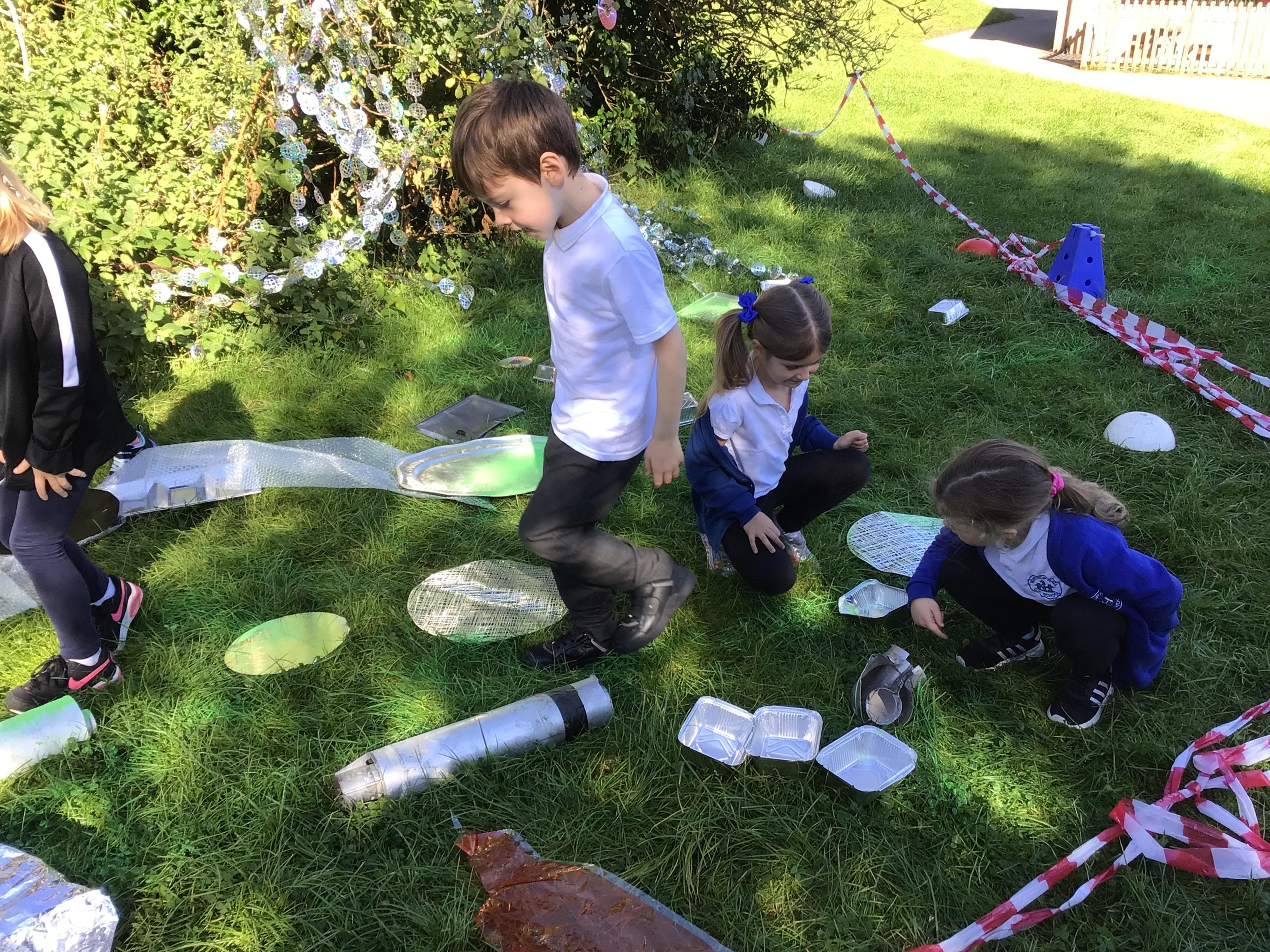 After receiving inquiries about flashing lights and mysterious noises, we went to investigate and couldn’t believe what we found! A spaceship had crash landed on our school field!!! There were pieces of spaceship spread all over and we even found some green space dust and slime!
