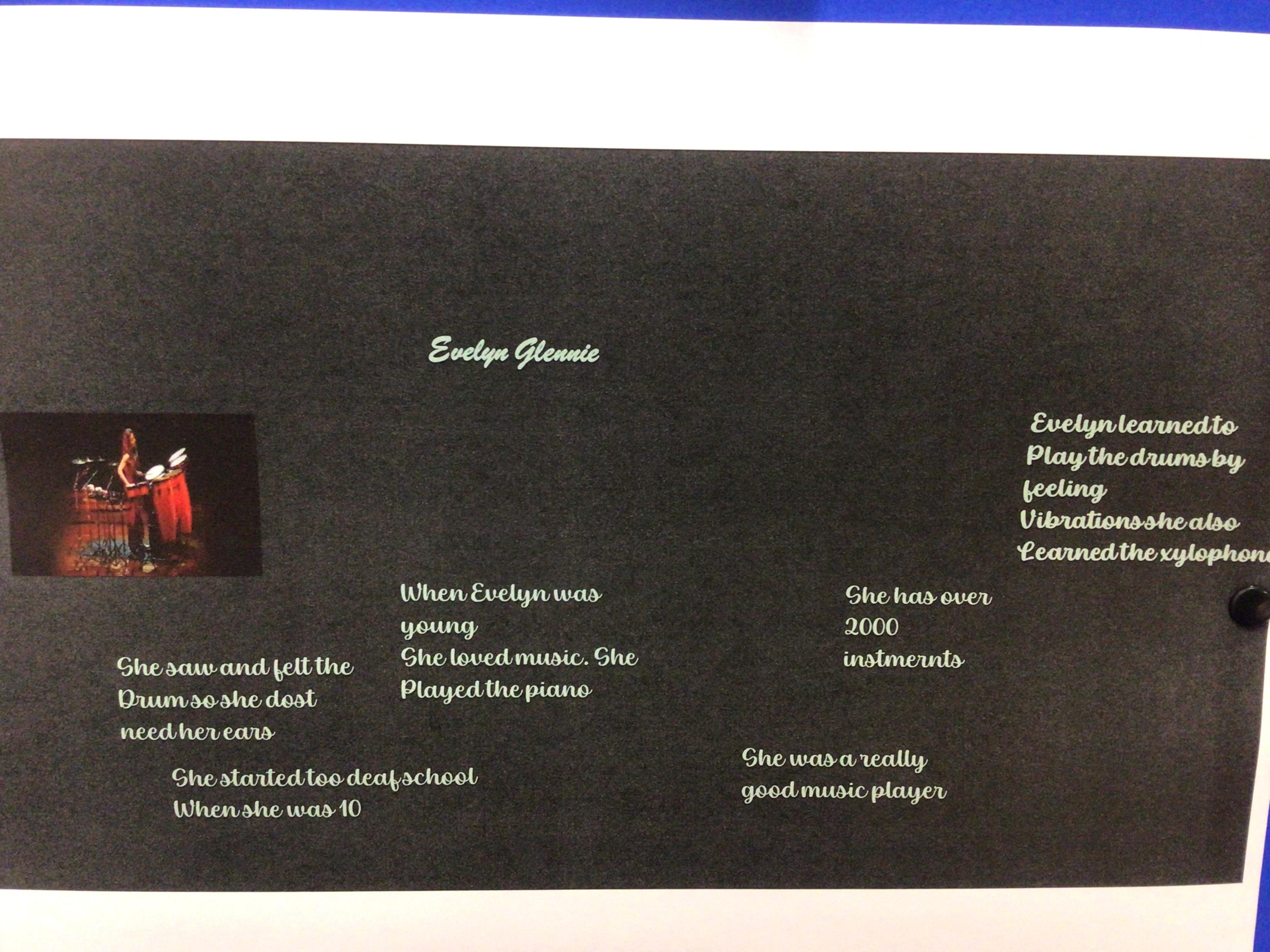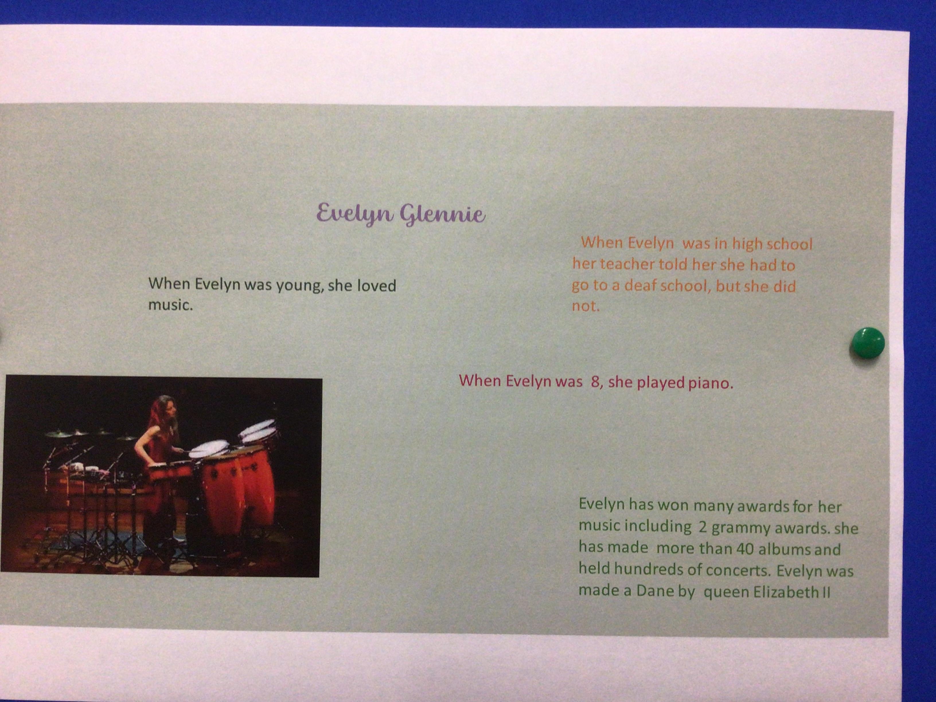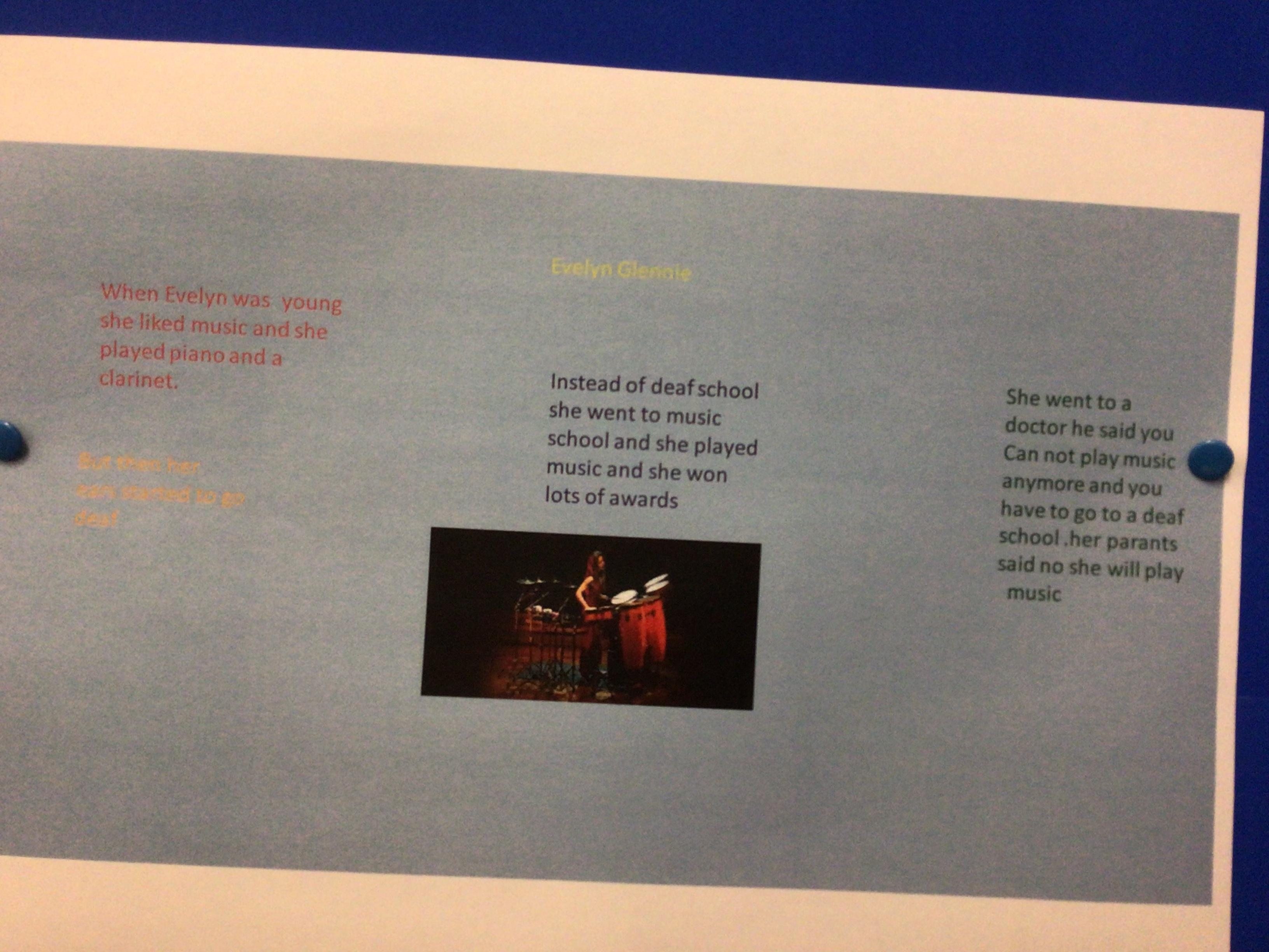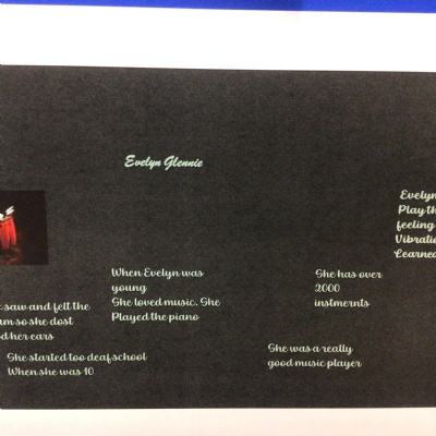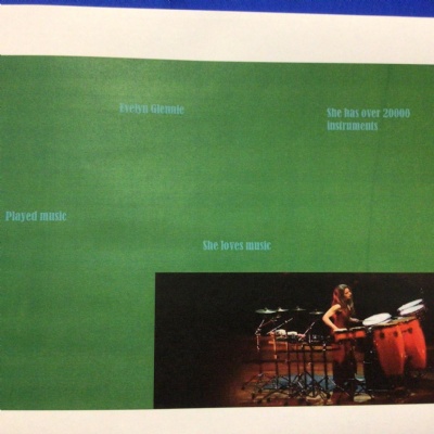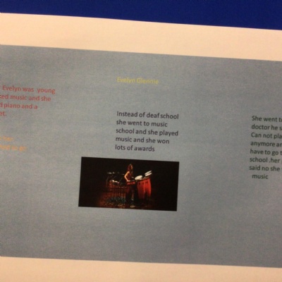 We have been learning about the musician Evelyn Glennie and made a PowerPoint slide about her life. The children learned how to insert a text box then change the font, size and colour of the writing; how to insert a picture; how to add animations; and how to change the background. They also had to share their work with me by creating a link. They have worked so hard!
